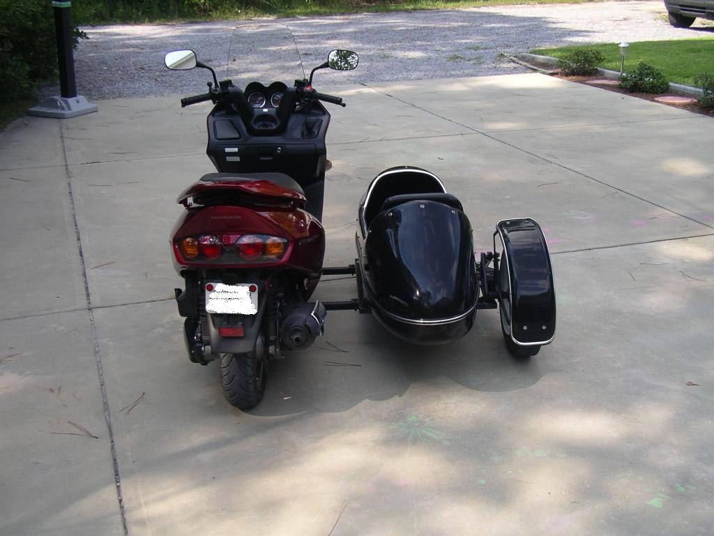 Bob Darden makes a neat set up for scooters for one of his Texas sidecars. He made the first one for Avanell's Burgman. New Burgman mounts came from Hannigan. Both work equally well. J.R.