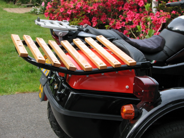 I made a subframe below the sputnick frame. on the right behind the sidecar wheel is a lawn tractor battery. In the center is a tool box and on the left is a loop than can carry several tires between the sidecar and bike. This loop is rugged enough to also be used for a cooler or the front of a broken 2 wheeler can be tied down for an emergency tow. (towed one over 75 miles)