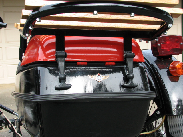 Due to the flimsy trunk lid attachments of the Sputnik your spare mount will have to either go from the frame around, through, or behind the body. If one had a tank or fuel cell in the sidecar trunk the opening lid could be eliminated and the tire mount could be installed within the rear sidecar body with just the mounting flange visible.