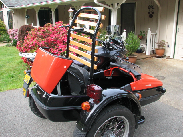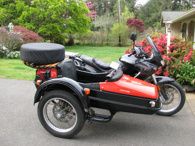 In front of the sputnick frame crossover is a 5 gallon gas tank that uses a low pressure pump to fill the bike's gas tank. In the photo next to the one I linked you can see the gas tank filler in front of the sidecar step along with the double sided swing arm that mounts the same front wheel the bike uses and the disk brake off the rear. The bike is an 81 r100rt bmw. Also barely visible under neath it all and in the photo to the left of the linked on is a sway bar.