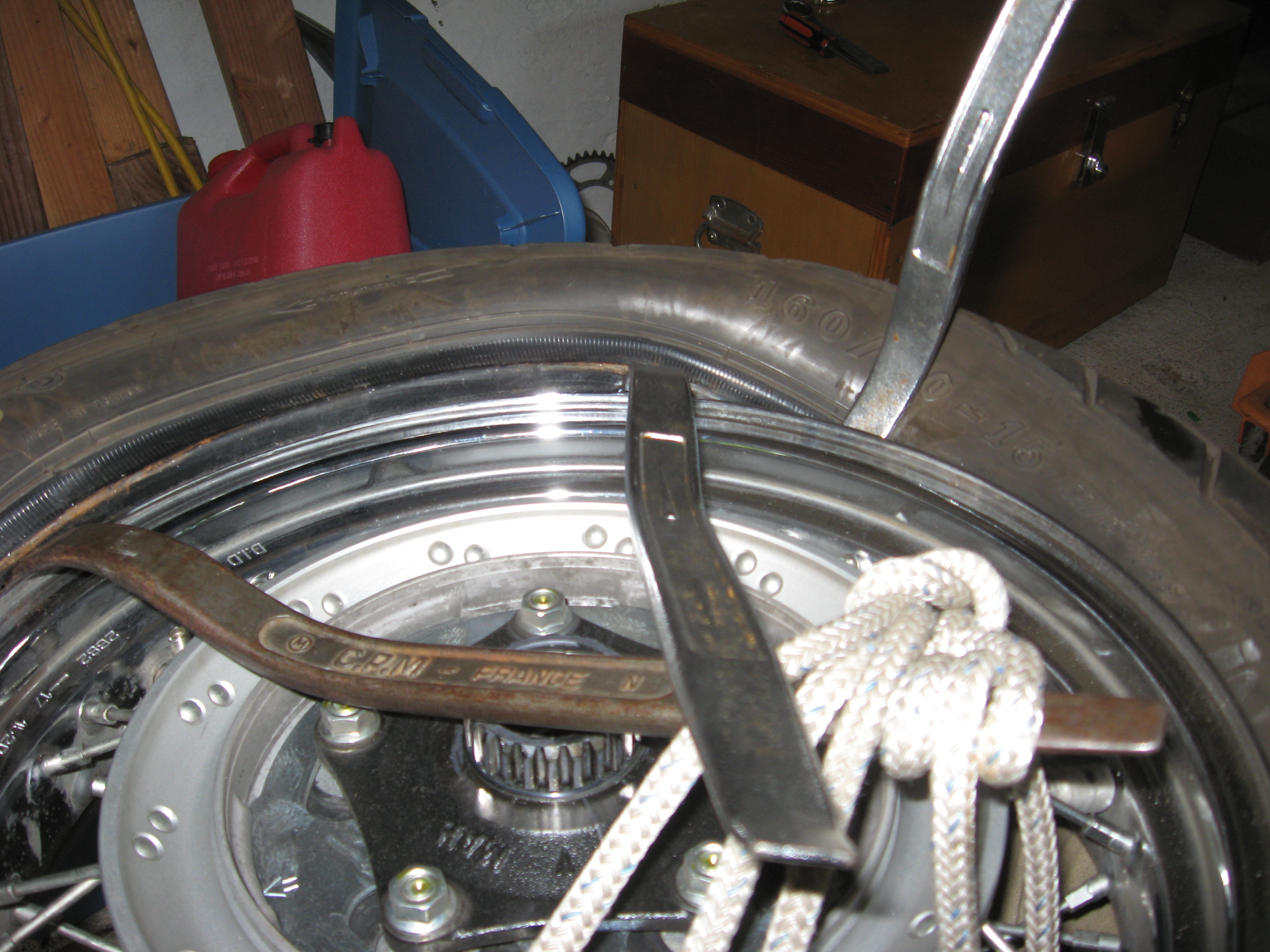 I use rope to hold the tire iron in place while using the other two to work around the rim. Wheel sits on a small galvanized garbage can for a work bench.