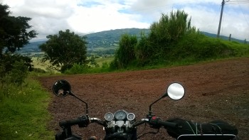 Sunday 180km of body building with the best of all wives crossing the Cordillera twice in between Poas and Barva vulcanos on the good twistees where 2 years ago was a big earthquake. Beautiful road now. 3 options you have open. Stay behind the Sunday drivers and burn the engine, overtake and have fun, or stop and wait until they are gone. The last 2 options we used as it is the Ural who dictates the speed. Lunch and coffee we had at an old studies colleague who was afraid to go even in the sidecar, anyhow as soon we got to her place the daily downpour locked us in for a couple of hours. The way back was in the fog.