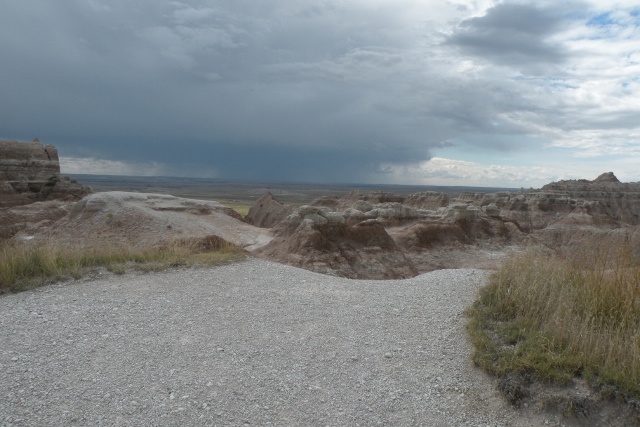 What did we do today? We dodged thunder Storms. Our plan was to tour the Badlands of South Dakota. The Forecast was for scattered thunder storms. What scattered means I really don't know but it is the only day we have open this week. The Short brothers and wives took off from Rapid City and rode the back road (highway#44) to the Badlands. toured the visitor center. It was a beautiful cool blue sky ride. We did lunch at the Badlands Cafe and returned to the rigs to start our return. There was storm #1 in the west. At a high overlook I stopped to take pictures of the storm. Now we can see storm #2. We stop and the next overlook to take pictures of storm #2 and now we see storm #3. We get on the road on the way to Wall SD. Yes Wall Drug Wall SD. We run through the edge of storm #2 and get a little damp and my gang will not let me stop to picture storm#3 because we need to race it to Wall. We Beat the storm to Wall, cover the rigs and spent some time in Wall Drug. They have nickle coffee and $1.60 doughnuts. The storm passes in about 45 minutes and it is an hour home on I90 interstate. 172 miles and we were only dampened by one storm.
