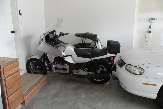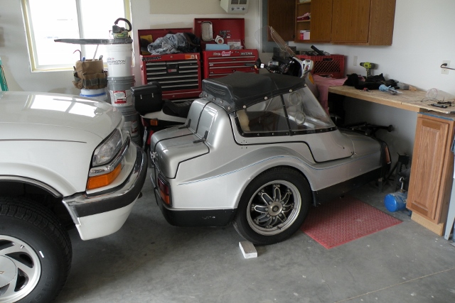 What did I do with my sidecar today. I got it out of the storage unit. The last trip We took with it was the Devils Tower Run that was featured on the front cover of the SIDECARIST. Shortly after that we moved out of our motor home and into our new downsized home with a normal sized 2 car garage and the rig went into storage for the winter. Then we spent the winter in Arizona. Then upon our return I have been building a work space in the garage. Bench, Cabinets and shelves. It is now time to begin moving out of storage into the garage, The first thing will be the rig. It gets a safety once over, a wash job and its expired KS plate replaced with current SD plates. The next trick with be to arrange the garage so that the rig, a Blazer and a Malibu fit with the door down. The first attempt was to put the front wheel and nose of the car under the bench, and bring the Blazer in. With the Blazer 2 inches frome the rig the Blazer is 4 inches from closing the door. The faring is against the bench but the wheel is still 10 inches from the wall. Doris suggested that I build a convertible bench with section that can be lifted out. You know that would work but not today's solution. Okay let's move to the other corner of the garage where we can get the front of the rig up against the wall. Now with the Malibu pushing against the mud flap of the bike the door lacks 1 inch of closing. The Malibu is Doris's driver. Even if this arrangement worked asking her to park with this kind of precision is out of the question. The Blazer is about a foot shorter then the Malibu, so if we switch sides of the garage we can get the door down. Switching sides of the garage is a little like switching sides of the bed. It will take some adjustment. The disadvantage of this arrangement is that the rig is a little in the walkway. The advantage is that I still have a 3X8 floor space in front of my bench.