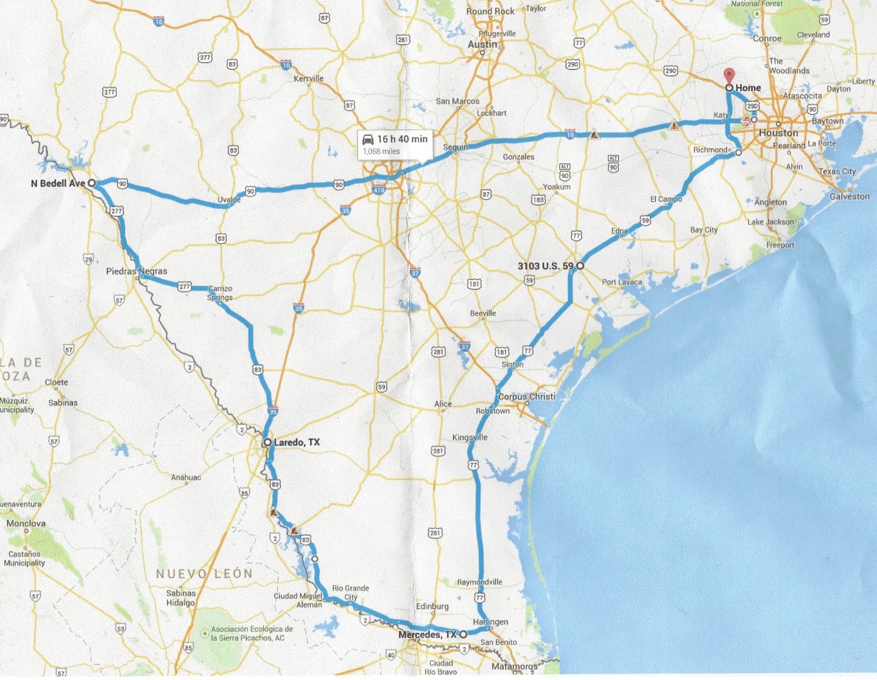 Route map - Houston - Harlengin - Laredo - Del Rio - Houston
