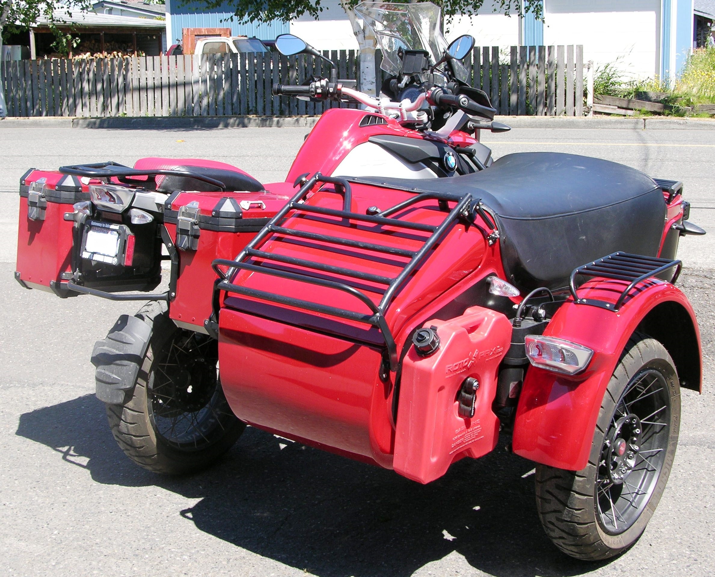 My BMW rig, (for sale) while it does not have a double sided swing arm I see no reason to want one. What it does have are all three wheels interchangeable and carries a spare, Heated seat to keep the passenger happy and even has front and rear WARN winches. I have had it fully loaded on a for travel and camping with my wife last March we did 3700 miles in 11 days of travel with speeds to 90MPH both on pavement and off.