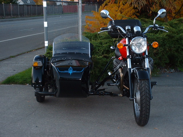 We have done many Guzzi's and as life members of the NMGOC own and ride these bikes our selves. We currently own two bikes similar to yours and have a customers bike in the shop at this time for a sidecar to be installed. As a result we have developed not only bike specific mounting hardware for these bikes we have even developed new from billet triple tree's to lower the steering effort. We usualy go with our M72C or M72CX sidecars on these bikes. The difference between the C and the CX is that the CX is wider and the Brembo disk brake is standard while it is an option on the C. Brake are always a good idea. These sidecars are well matched to the Guzzi in both size and weight. Other sidecars may not be. I know of at least one person who would still be with us if a dealer had not installed way to light of a new sidecar on a Moto Guzzi Stone.