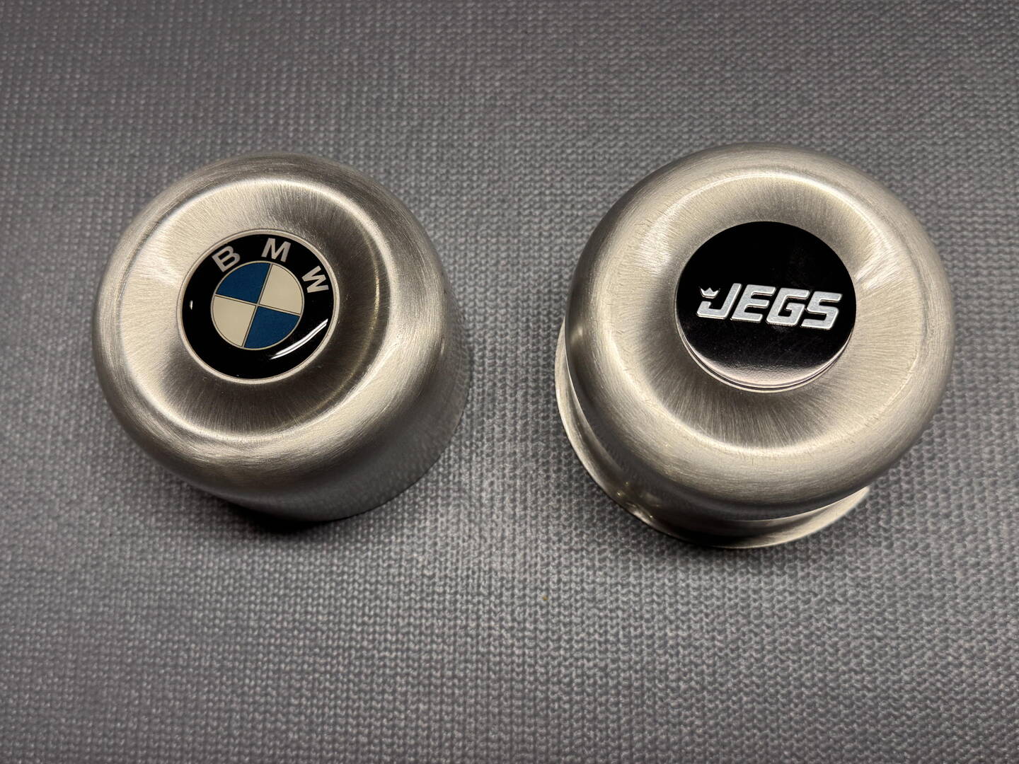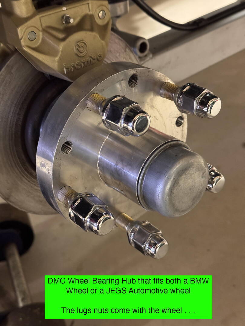 - JEGS center cap with a BMW medallion and altered to fit onto the DMC Wheel Bearing Housing