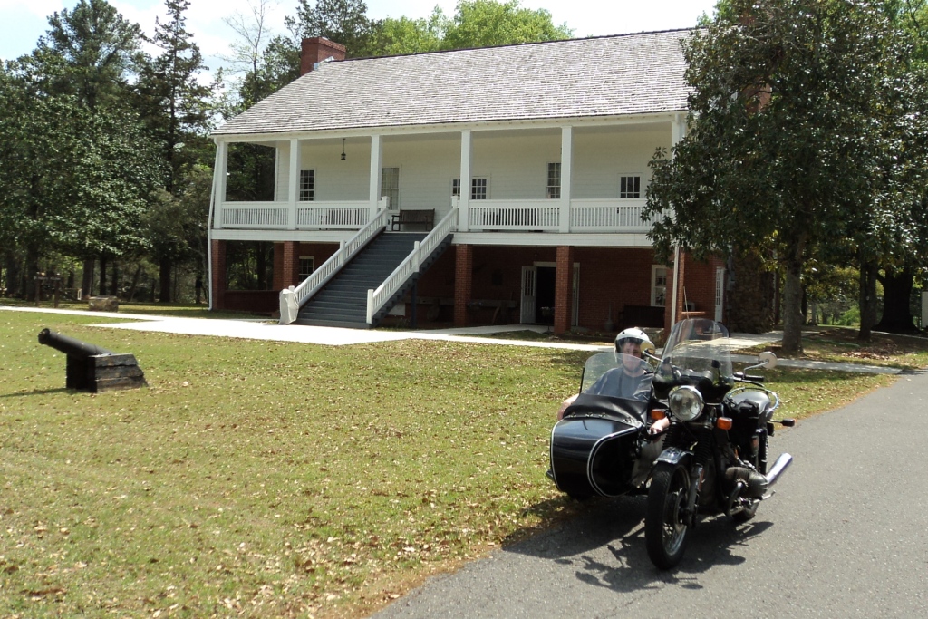 As luck would have it, we didn’t find this “po-boy heaven” and finally settled for a quick bite at Burger King. Neither one of us was too hungry, and besides, we were already planning where to eat dinner on the way home (is it just me, or does riding seem to become a quest for good food each trip?). We gassed up the bike and I notice the sidecar tire was a bit low, so then began a hunt for a working air machine. We located one at the Texaco at the intersection of Hwy 171 and Hwy 6. I pulled out my handy-dandy mini-computer (that’s what my phone has become to me) and looked up the location of Fort Jesup on the mapping program and checked our location to it. The historic site is located just 6 miles to the east from Many on Hwy 6, going toward Natchitoches. We rode through the old down town area again and viewed some really nice older homes along this old route. After 6 miles from the down town, we sure enough came to the sign directing us to turn right onto another road to find the fort. We barely rode another two-tenths of a mile when we came to the fort.