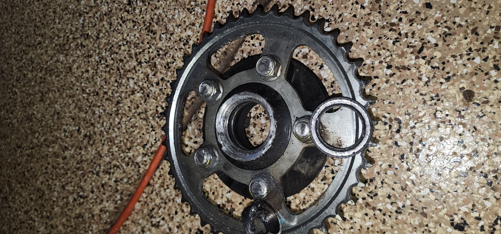 Evidently there was some damage/grit that got into the rear sprocket carrier bearing (think left outer wheel bearing of the 3 bearings on the axle.) It failed catastrophically last weekend, with about 8000 miles on the hack conversion. Unfortunately, the bearing came apart and destroyed the pricey Haan Hub that was in the center of the Woody's wheel. Pic below: