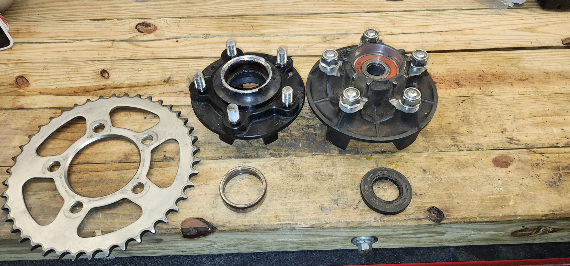 Icing on the cake? Well the Haan Hub actually uses a smaller bearing than the factory set, a 52 mm OD, 20mm ID bearing vs the Honda bearing that is 56mm OD x 22mm ID, and rides on a sleeve to be able to be a larger bearing. The Haan Cush Drive is also significantly smaller and showing signs of rubber wear at only 8000 miles. I suspect the Haan hub is underspec'd to be a pusher on a hack. I will likely figure out a way to get a stout wheel built up for it in the near future, using the OEM hub and cush drive. Comparison pic below, Haan hub on the left, OEM on the right: