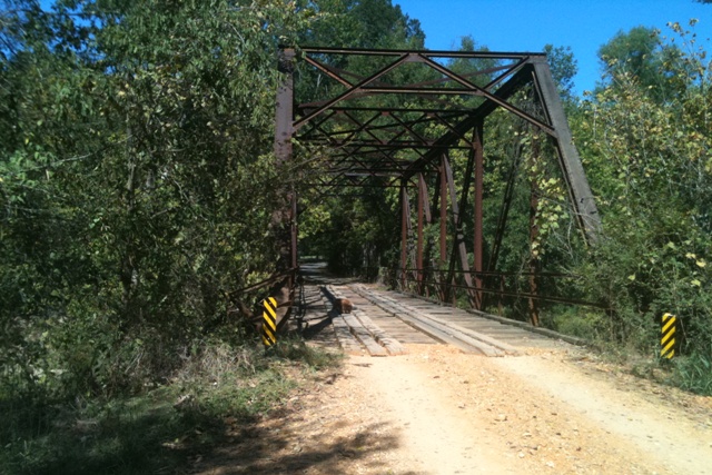 On the way to Elmer's we stopped off at the 1920's one-lane bridge over the North Boat Ditch of the Terra Noire River in Clark County, where Tahobiker hi-centered his touring rig while trying to dodge a flat-inducing nail.
