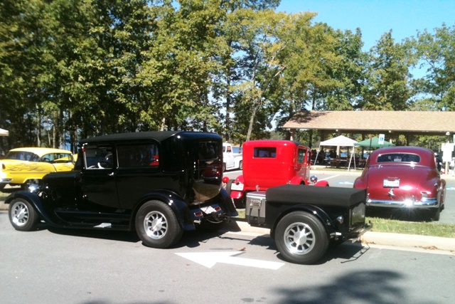 Here are pics of parking lot "fellowship" after breakfast, after which about 1/2 of us traveled over the DeGray Lake State Park for the street-rod rally. The black rod with trailer crafted from a Cushman Truckster pick-up bed was for sale -- mighty nice, but I'll stick with my rig.