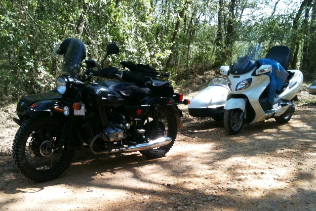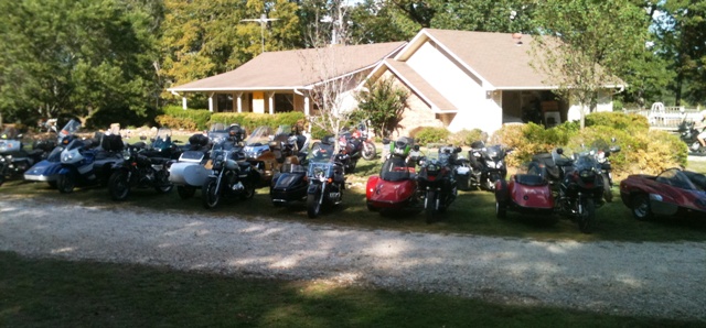 Saturday was a breakfast ride winding around on roads and to places I don't know. We ended at a local country store/dinner, Elmer swears he tried to call and warn them, but I think he didn't want them to close. We took over all but two tables and the two young waitress were very wide eyed. They did a great job and served a good breakfast with no known complaints. We did alot more BSing and enjoyed the food and company! We were free until 2pm for the sidecar games. So most of us followed Swampfox down to the Caddo lake and to a custom car show, that just happened to be there. Around 2 everyone gathered back at Elmers for the Games. Being our first event, we were volunteered to go first. After several events and histerical laughter from the Navigator, my wife. We discovered women need to use their hands for giving directions. And driving with a blinfold on is really strange, even hard to tell if your moving. I believe for our first time we gave a pretty good showing/performance of our selves! We then had more BSing and checking of bikes with a few repairs (mostly to Urals). A VERY good BBQ dinner was catered in Pictures were taking and we settled in for the awards, batteling the giant mosquitoes for a place to sit. We had a 50/50 drawing and the winner graciously donated their prtion back to the local charity, not to be out done everyone else chiped in and we ended with a $500 dollar donation outstanding for such a small group! As it was now after dark the group quickly broke up and headed out.