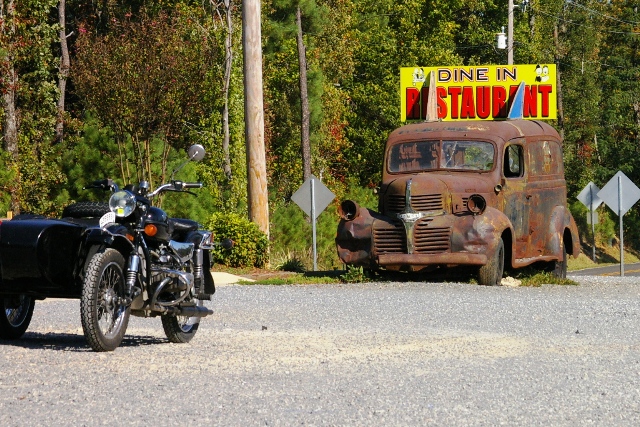 Seems most on-lookers presumed Schdodja's (one of the Soviet Steed fellows) Ural rig was older than the truck advertising the restaurant.