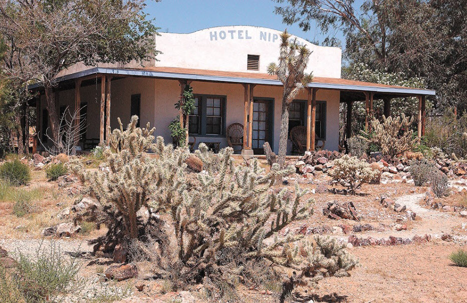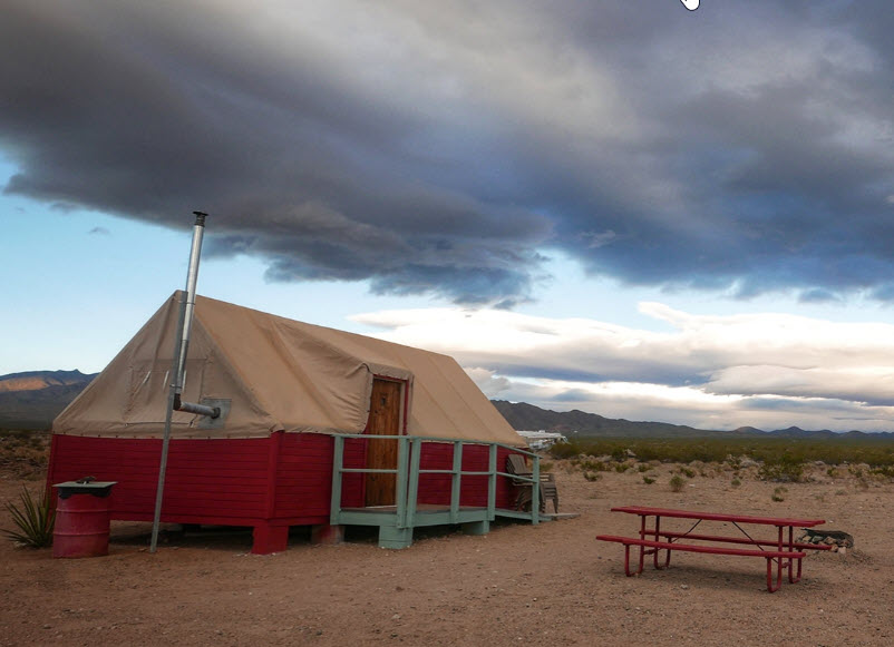 Hotel (small), Cabins (kind-of), Café ("Should be open by that time"), RV parking, and Camping. Lots of views of the desert and superb night skies. Mostly quiet - except a few times a night when the train rolls through. Hint: The hotel provides earplugs for guests...