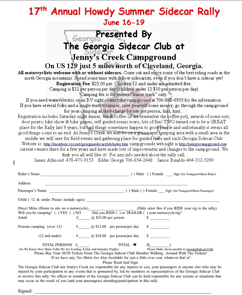 The Georgia Sidecar Club has moved its date for the Howdy Summer Rally to June 16-19th. It will be held at Jenny's Creek Campground, about 5 miles north of Cleveland, GA on US129. All sidecars, solo bike, trikes, and anyone interested in sidecars are welcome.