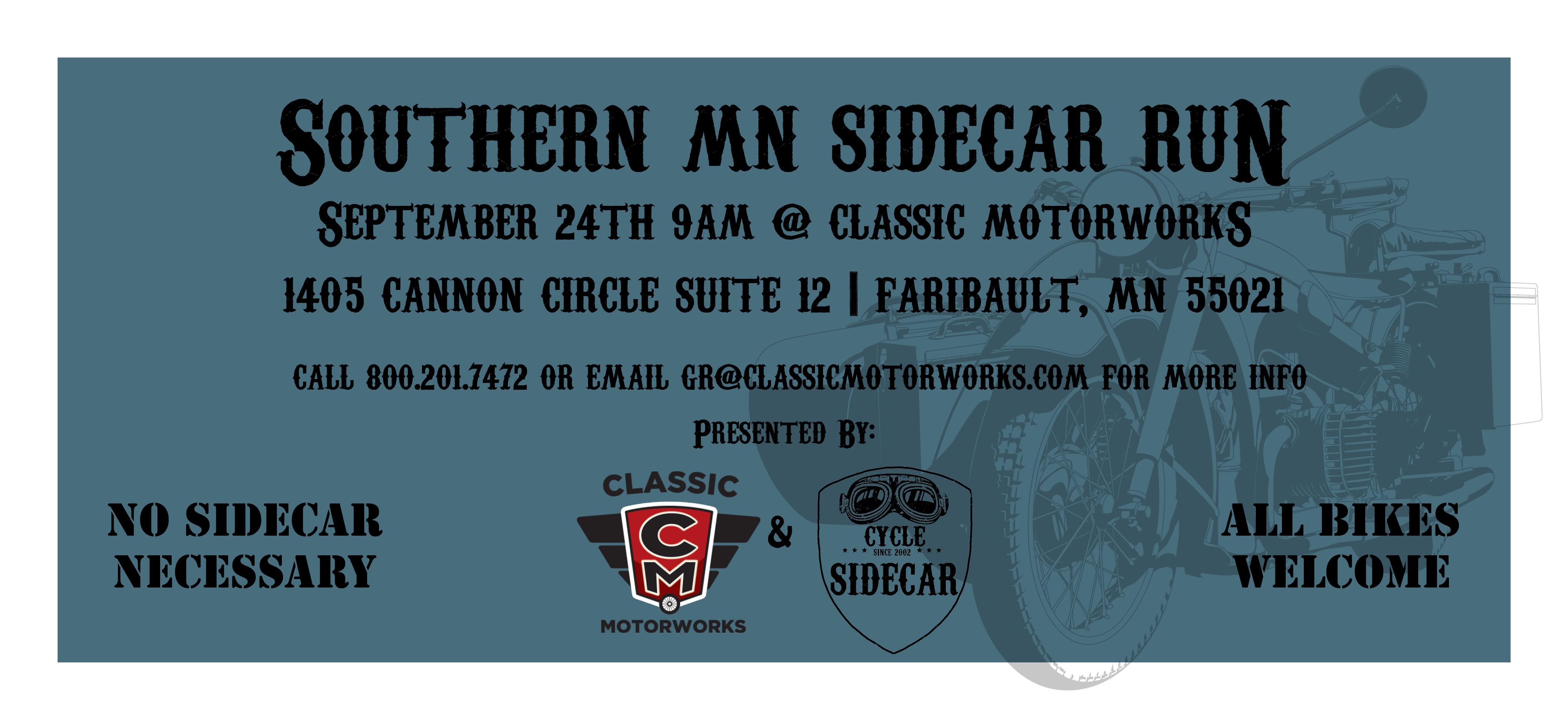 Classic Motorworks will be hosting our very first Southern MN Sidecar Run! All bikes are welcome and having a sidecar is certainly not necessary! The ride will take place on Saturday, September 24th leaving at 9:00 am from our location in Faribault, MN and stopping at Dave's Place of Lafayette for lunch, then heading back. Arrive at 8:00 am for coffee and donuts and to receive your FREE Cycle Sidecar patch! Come and enjoy this free event and learn more about sidecars!