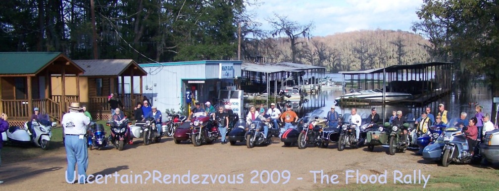 The Caddo Lake Rally of 2009 will be remembered as the Flood Rally as Caddo Lake, after approx. 10 inches of rain in the preceding week, finally crested Monday at 3 feet over flood stage . By Friday, many local lake access roads were flooded, and the Shady Glade Cafe flooded by mid-day Saturday. Accordingly, we had to re-group and re-plan the rally events almost hourly, but everything came together with only minor confusion, with many attendees stepping up to assist with games, door prizes and cooking. Thanks to Kris of NM contributing her winnings from the Domino Run to purchase groceries to feed the group on Saturday evening. And thanks to the Mayor of the "City" of Uncertain for donating cheese & chips for nachos to feed our hungry bunch. And thanks to Barbara & Jena of LA cooking breakfast on Sunday morning.