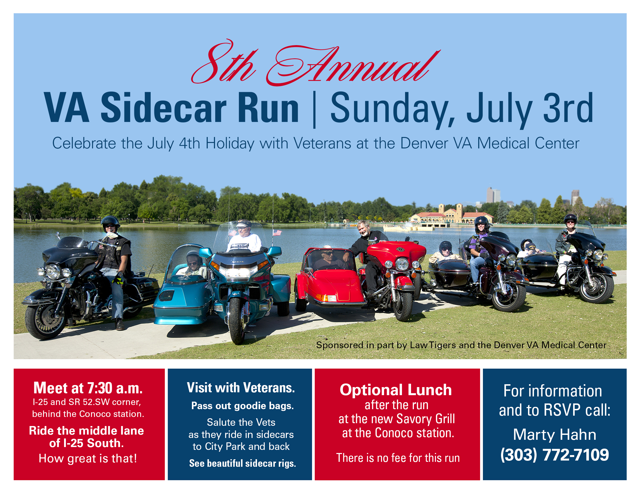 If you are in Denver around Sunday, July 3rd, you will enjoy this salute to our veterans at the 8th Annual VA Sidecar Run.