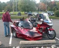 I see you have a HONDA too! Red IS the best colour! Is the a Shepherd? My lil dog is a dorkie...the joke is, what other dog would I own? HAHA!! Nice sidecar! Is that what one calls a HACK? Sorry, i am a newbie but hear that term alot...