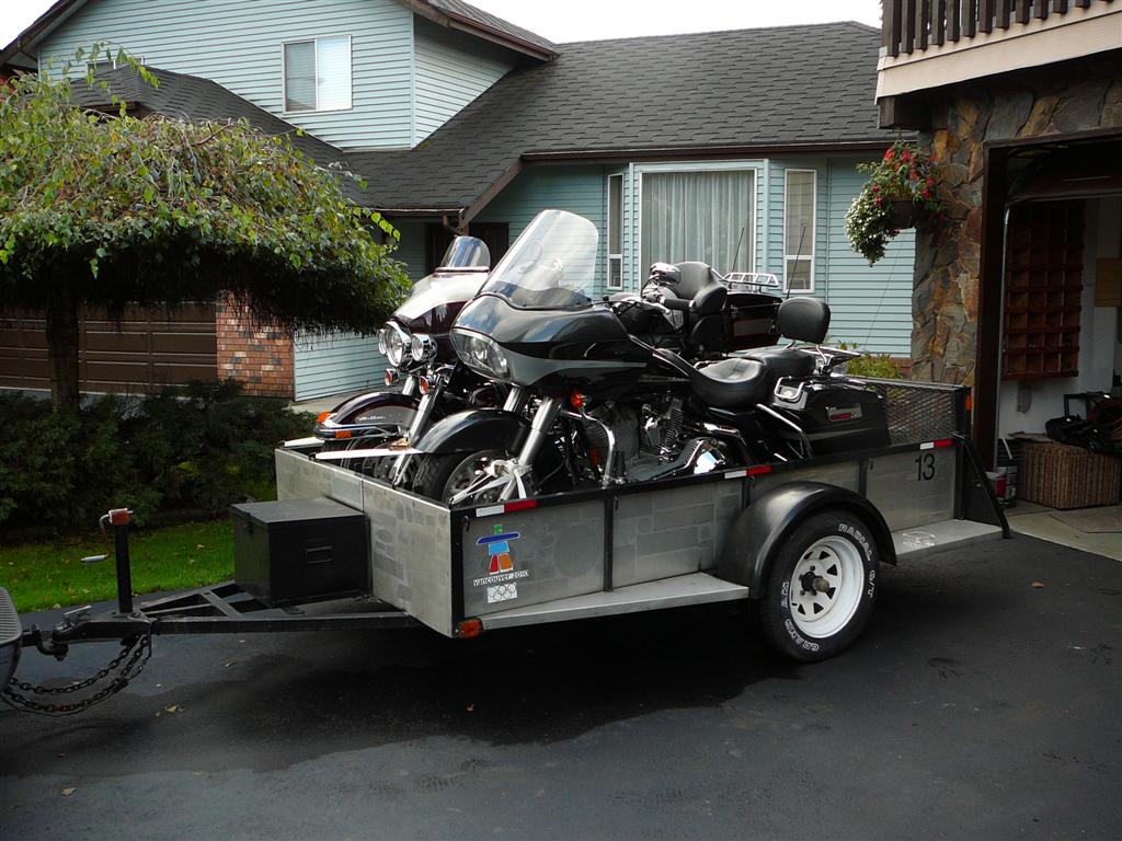 I have a Featherlite trailer 6' 6" ft x10ft. My two Goldwings 1500 w/ Hannigan 2+2 fit easily on the trailer. The Harley Ultra with Hannigan 2+2 fit on it when I cun off the left fender to clear the bike.