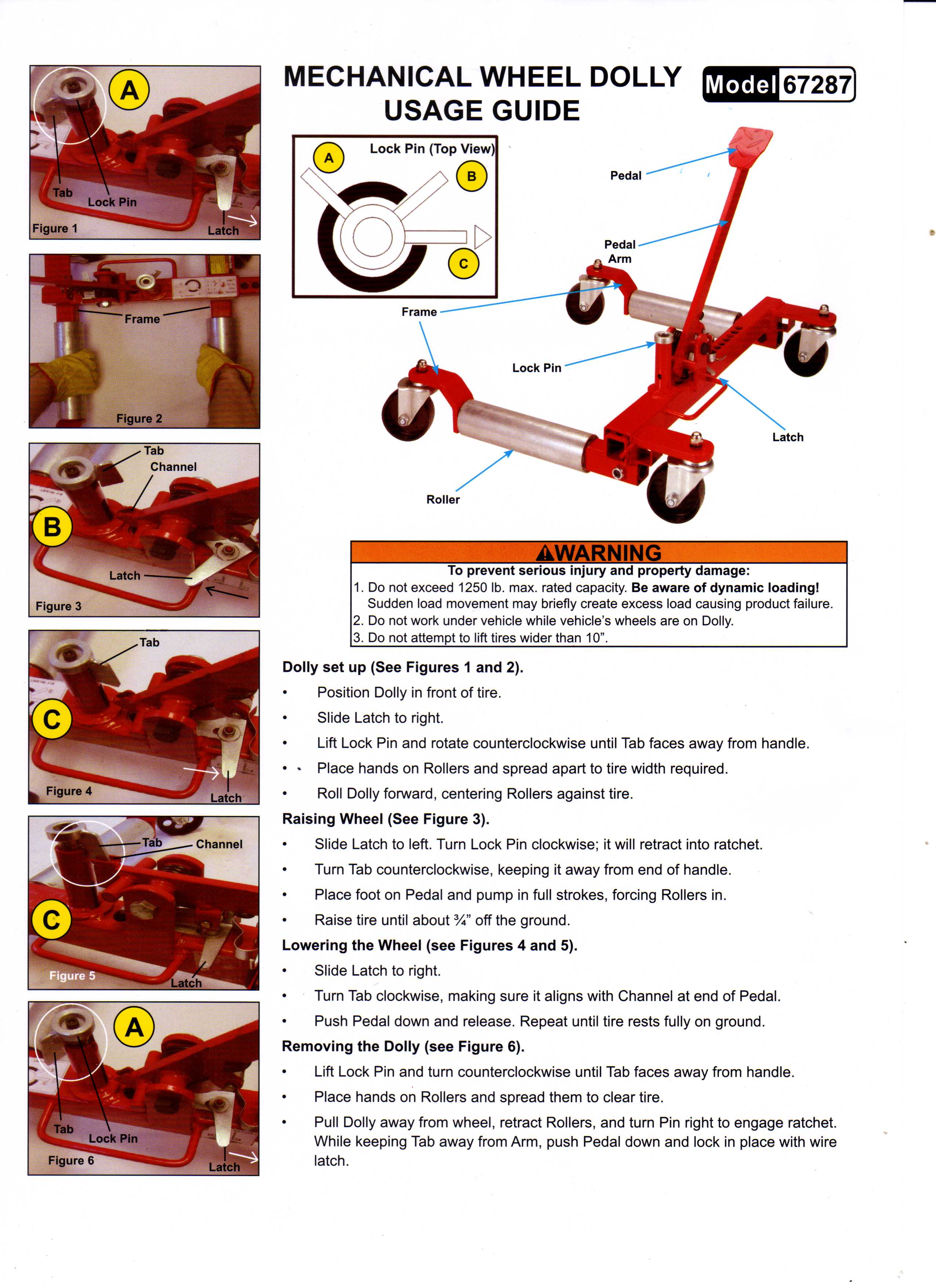 You will need a dolly that goes under the sidecar wheel, and another dolly that supports the inboard (bike) side of the sidecar. For the dolly that goes under the wheel, I bought a wheel dolly from Harbor Freight, U.S. General Model 67287. It is under $100 and works great. For the inboard side, I bought two 5" casters at Lowes and mounted them to a piece of 2x4. Many others have included photos in this thread of similar setups. Attached is the instruction sheet for the wheel dolly.