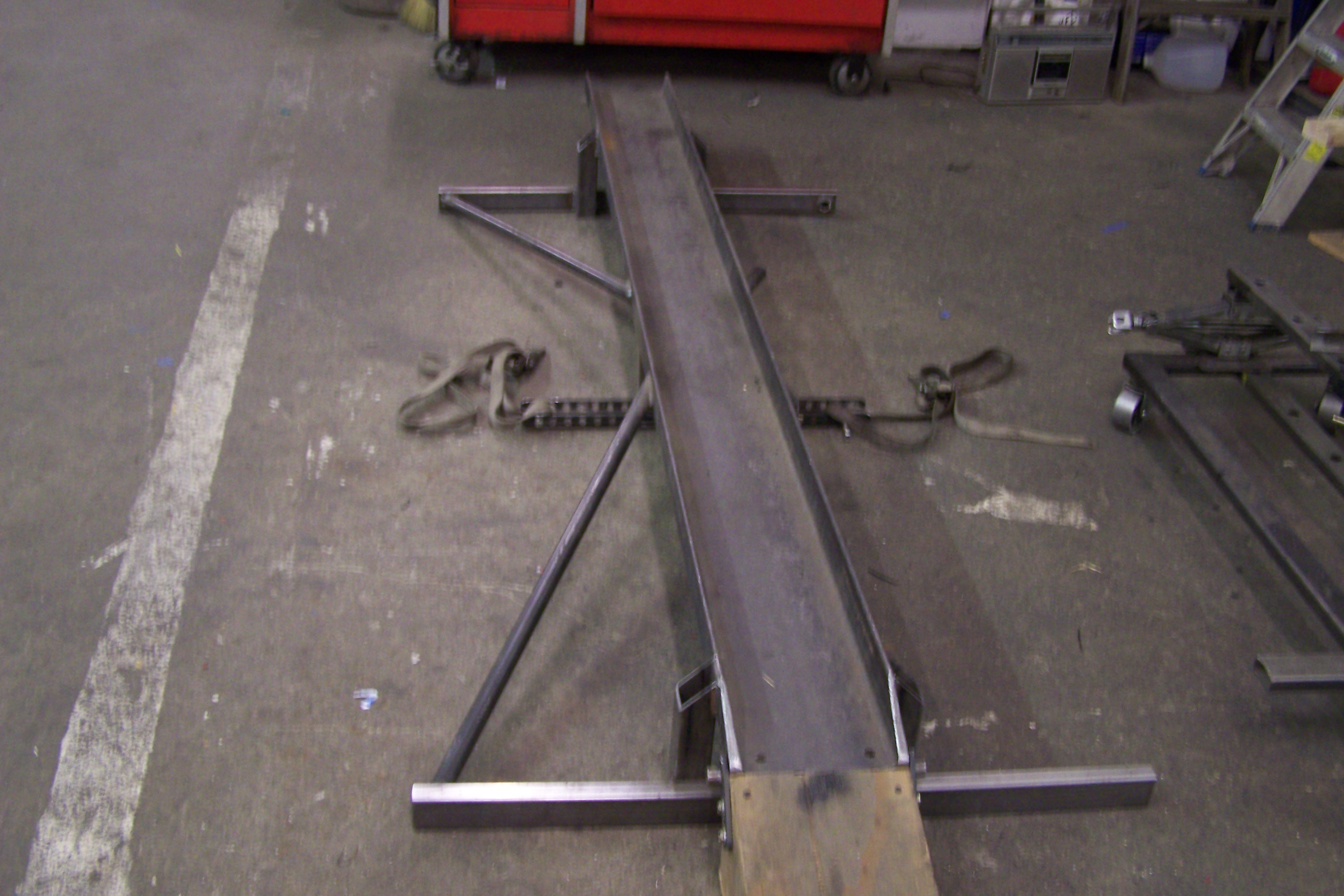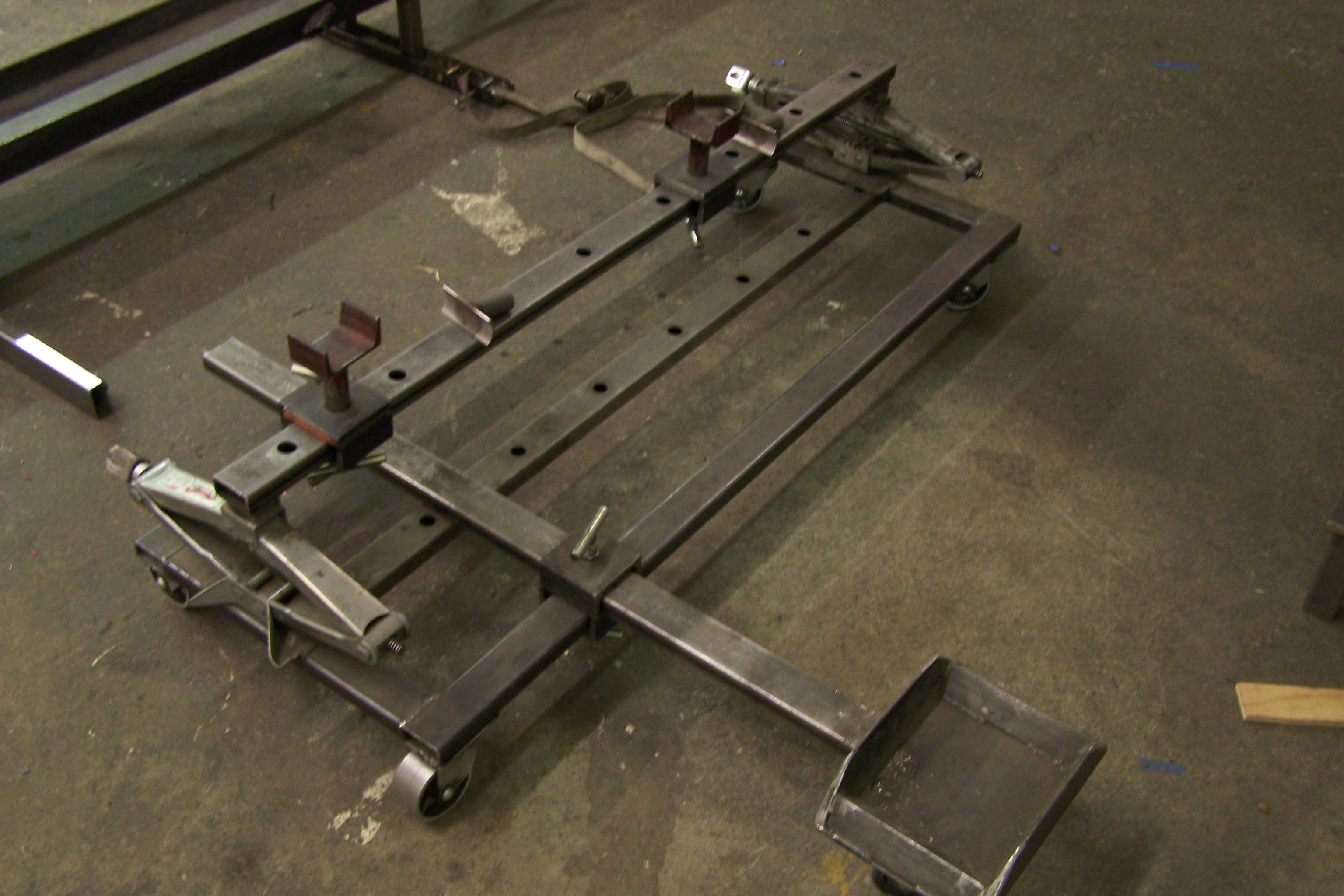 I built a couple of stands that allow me to roll the sidecar around while installing or taking it off for maintenance. The bike stand also allows me to secure the bike with preloaded suspension as if the rider was on it and the appropriate amount of lean. The straps wrapped around the driver pegs or the frame hold the bike secure and the stand also lifts the bike off of the floor slightly. I'm getting too old to be crawling around on the floor like I used to. 🙂