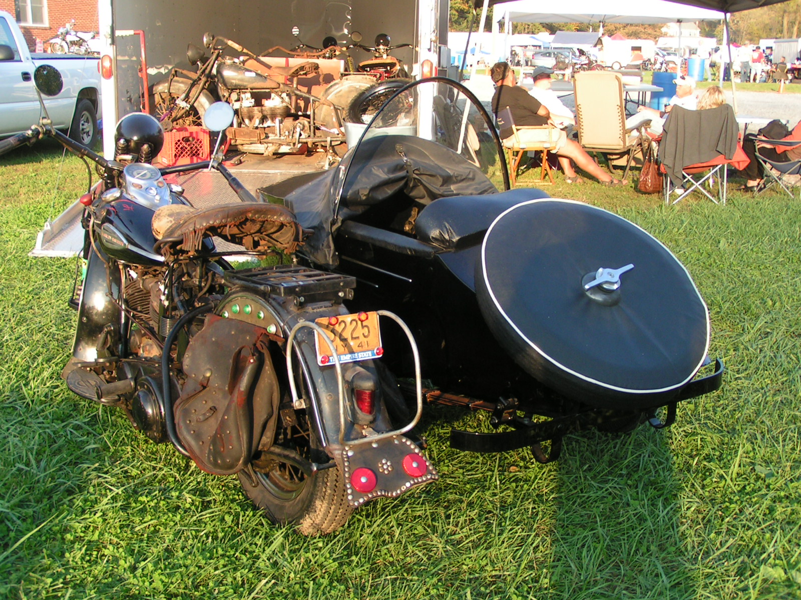 I just can't convey how helpful these pics are. I'm excited about the sidecar all over again! I have more confidence in my recent decisions both about the hack and bike. Just so happens I got a new spare tire cover exactly like the one in the flathead pic and the accessories on the '65 are exactly as I have or want. I have a complete set of correct white rubbers ready to install all the way around and white windshield bag. Most are like I already have on my '63. One thing unresolved is the front lower fender trim cap. I can't see if either of the '65's had the chrome lower front fender "cap" with black highlight lines in the depressions. I have original '60, '63, '65 and '66 H-D accessory catalogs and can't find it listed. Meanwhile, Greg Fields's Panhead book shows them on all examples of '65's. I bought a repop and resorted to using 1/4" black pinstrip tape to fill in the depressions. I tried to paint them in using several methods and couldn't get the paint lines to look decent. Working from my Barco-lounger, it turned out great with the tape! I was wavering about a fender trim cap for the sidecar fender itself. I gotta have one now, especially after seeing the tail light is the same as mine. I even have an extra RH-55 (plastic)lens to install on the hack's taillight. I had a glass one and broke it by accident one day. That would have paid for a lot of stuff today. Got better pics of your '72/'65?? Gimme, gimme, gimmee! Now... just for guys... if Blondie sees that complete cover (overhead) canvas like the '48 rig, she'll want one, having the biggest hair in Arizona. There's no place to get one, correct??!! CORRECT!!??? Get it!? Uzzz guys are great! - AZP uhhhh.... looked up "sledge riding". I've never lived in snow country and just lived in snow while in the field in Korea and Japan including a winter Mt. Fuji trek. I have the stamped walking stick to prove it! How does a "sledge ride" involve a sidecar? Sledge riding? huh? You gotta take the car off, right?