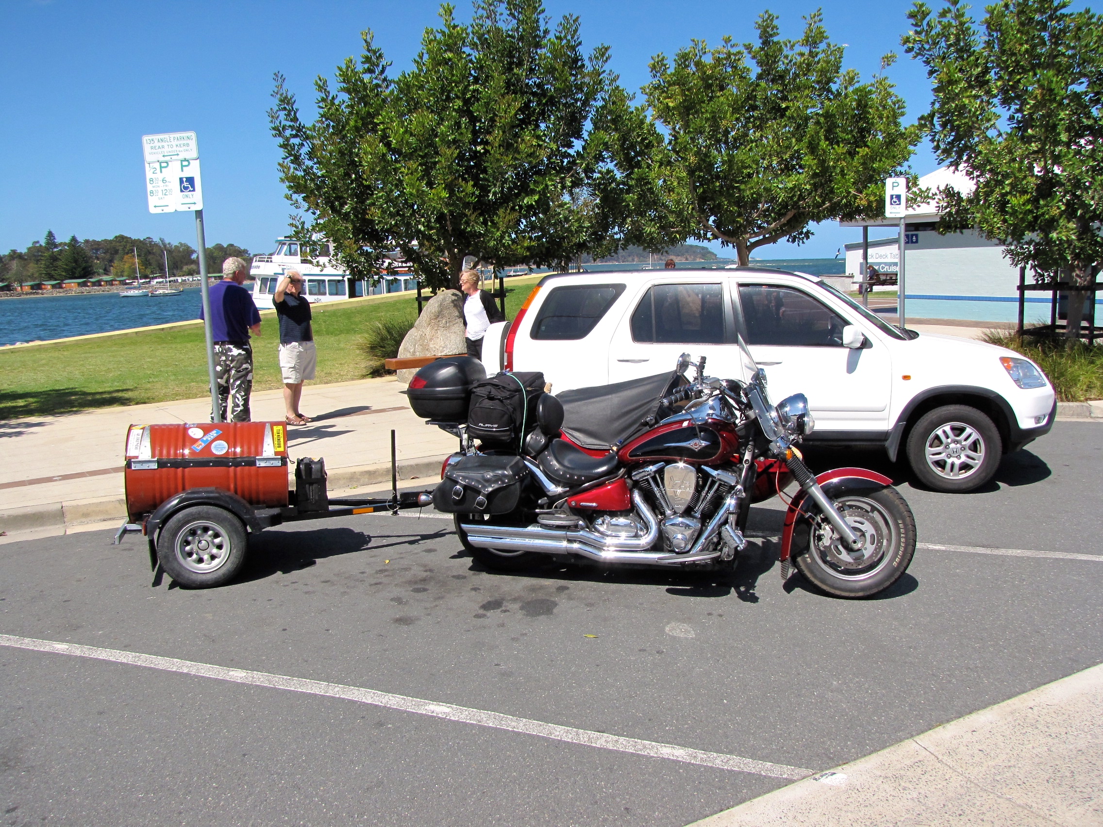 Our trailer was from a design I had seen before, esentially a 3'x4' flat bed with leaf spring suspension with a 440lt car cargo (roof) box bolted to it. Luckily my rig builder still had a little paint from when he made the chair so we got it color coordinated and pin stripped to match the bike & chair.