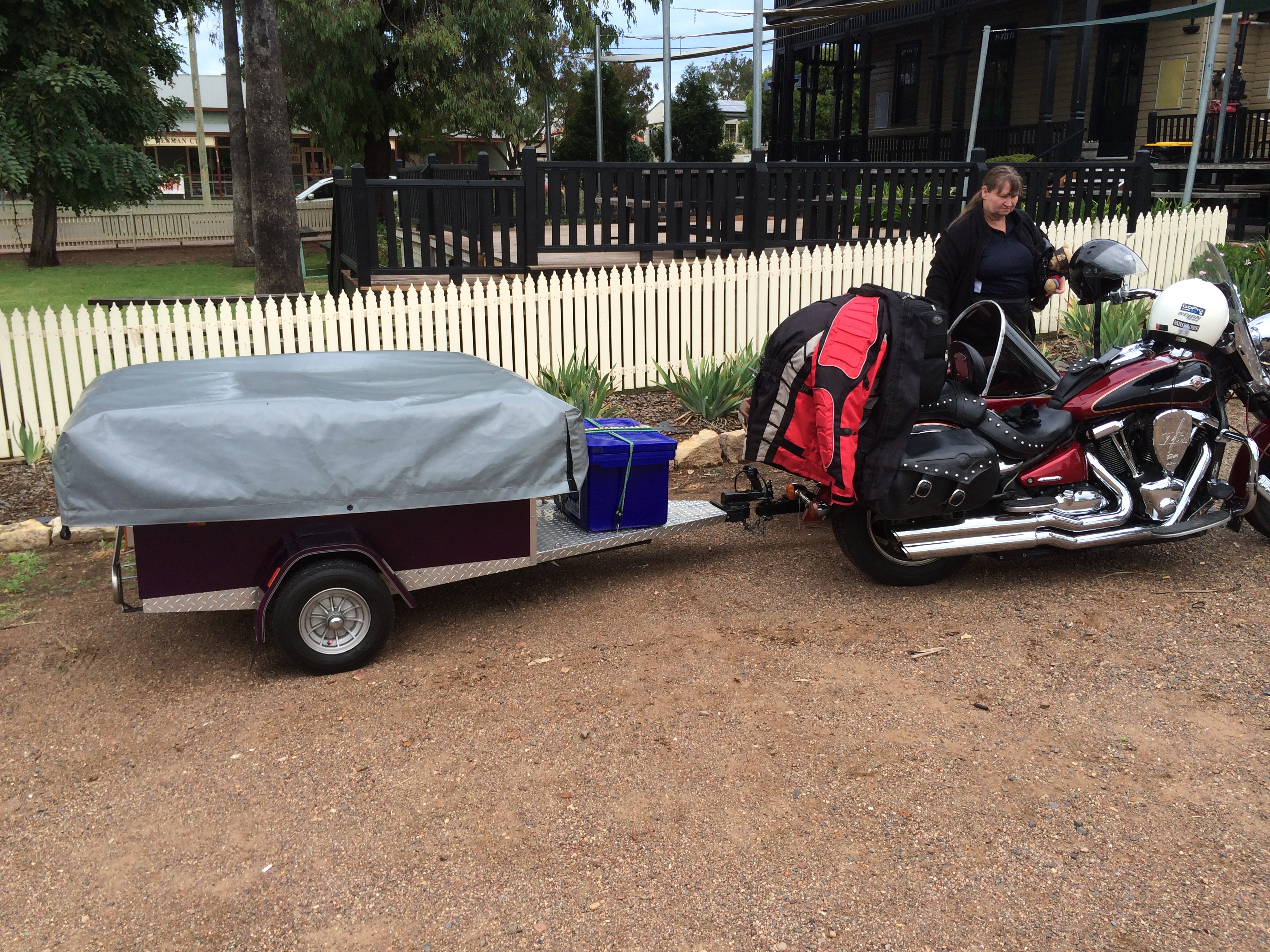 Back to the trailer hitch, I settled on pulling the trailer from the chairs right hand main frame, this is almost centre of the rig setup. I have not noticed any undo handling affects under acceleration or braking (BTW I do not have a brake on the chairs wheel). It ended up being relatively easy to make the hitch which was fabricated out of a piece of 35x70mm box metal bolted to the frame at the front and side. The hitch and the trailer being custom made together meant we could get the tray pretty much horizontal. The good thing about the sidecar is that we can get away with a standard ball and hitch arrangement and not worry about bike angles etc.