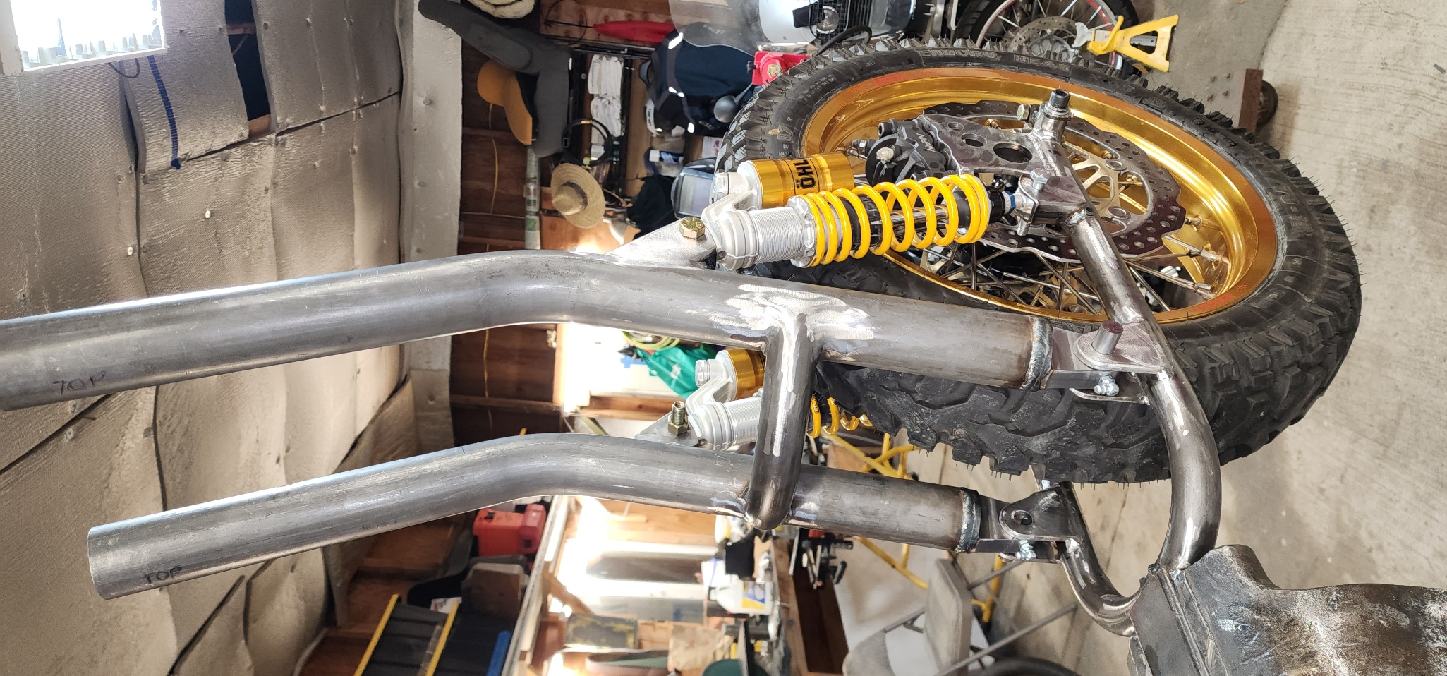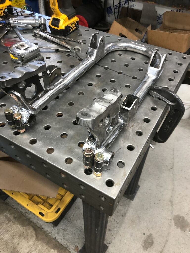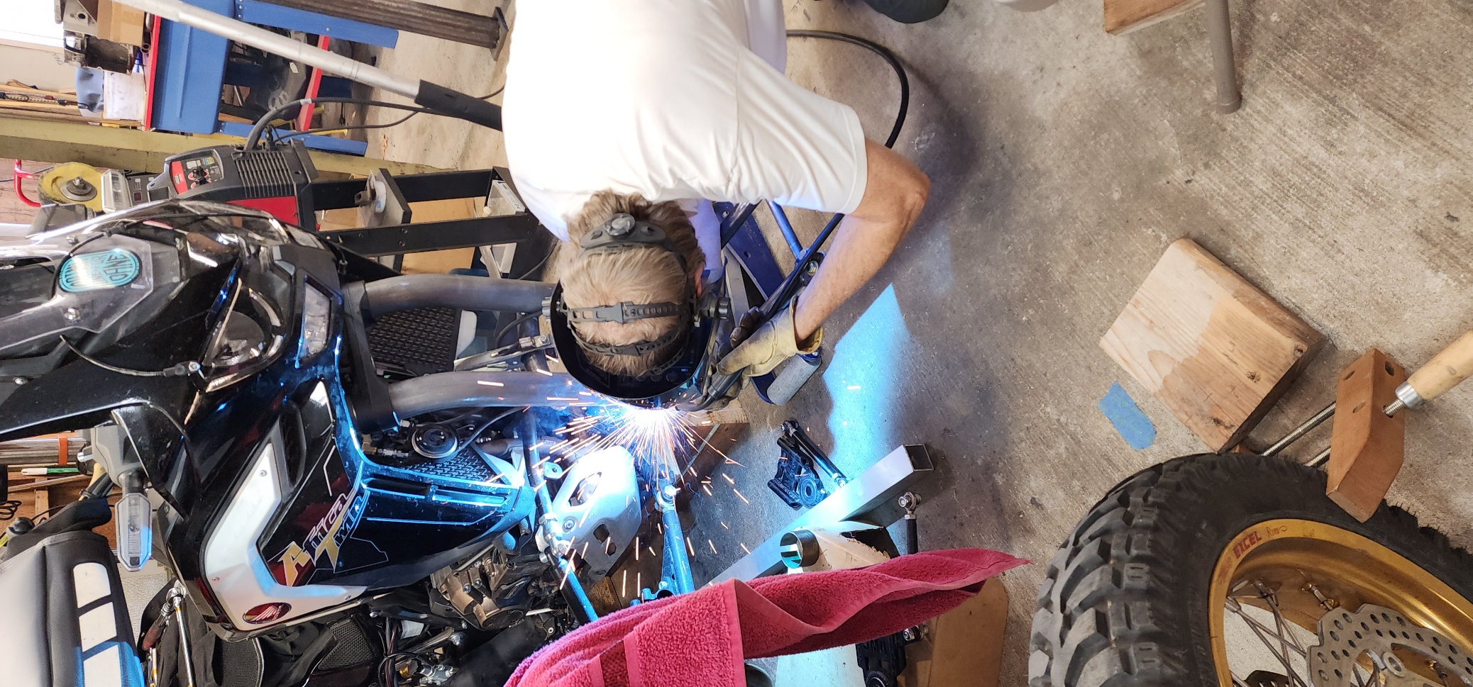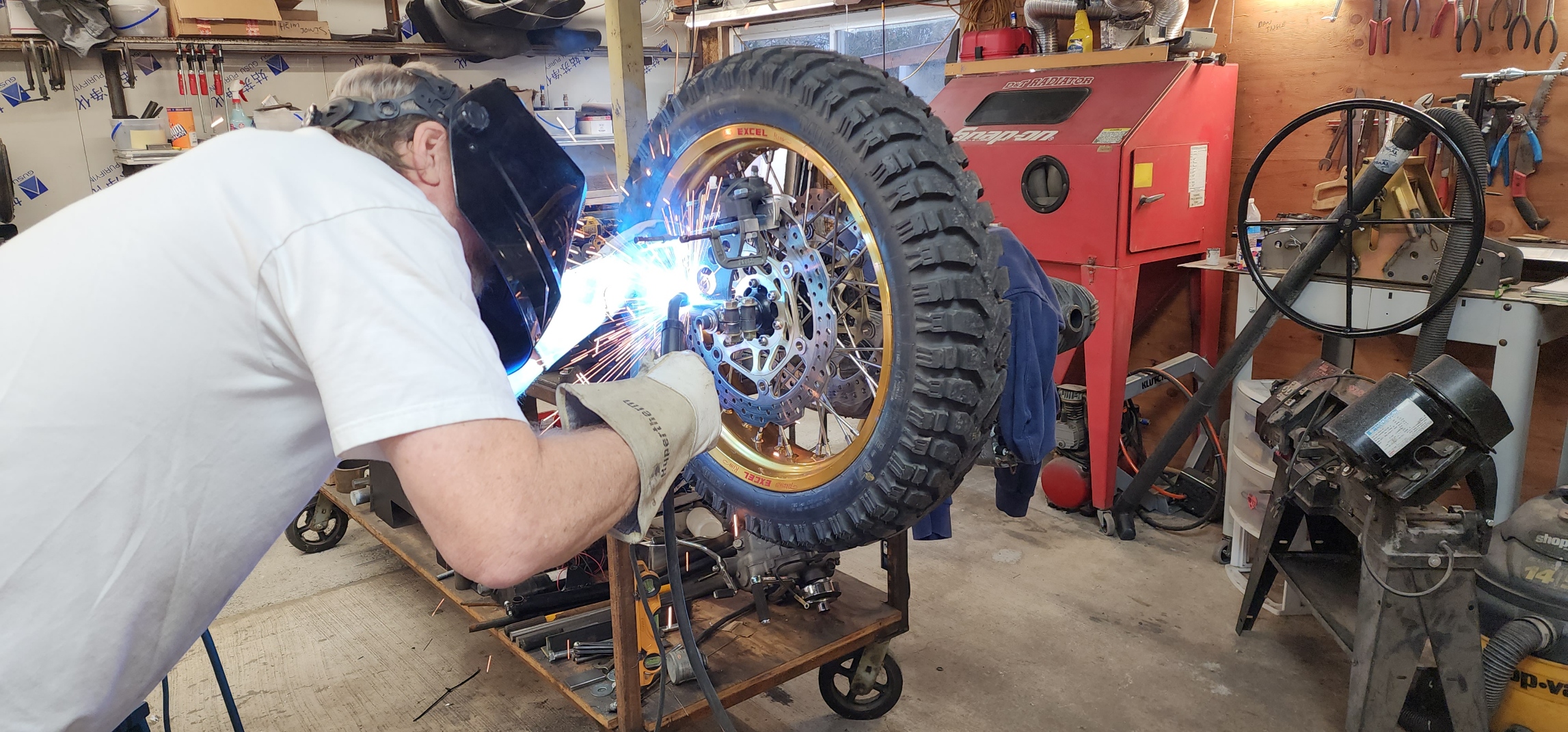 Things were tacked in place for low speed test drives to check out steering feel. We had originally thought about two mounting positions for the swingarm pivot attach points, to be able to vary trail reduction. We decided to tack things up and test ride, instead, to get it right.