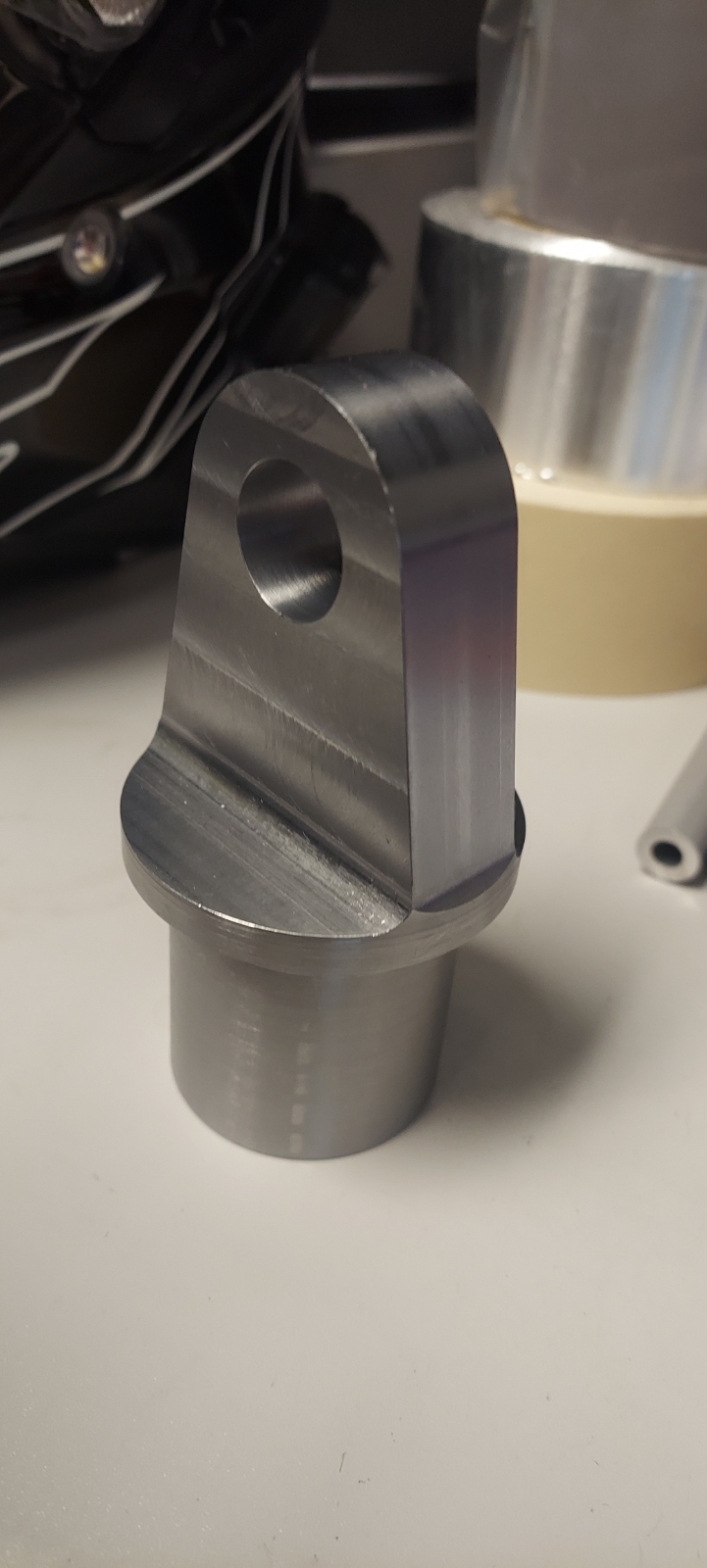 Close up of the nifty pivot bearing shaft and retainer that Chuck designed and built. Easily removes for swing arm removal/bearing service. 5/8" shaft material, polished up nice.