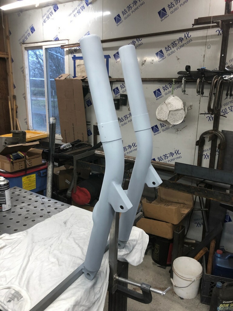 Getting the fork legs to be exactly the same was a key goal that was accomplished: This was done by slow, careful tubing bender operation, with many checks along the way.