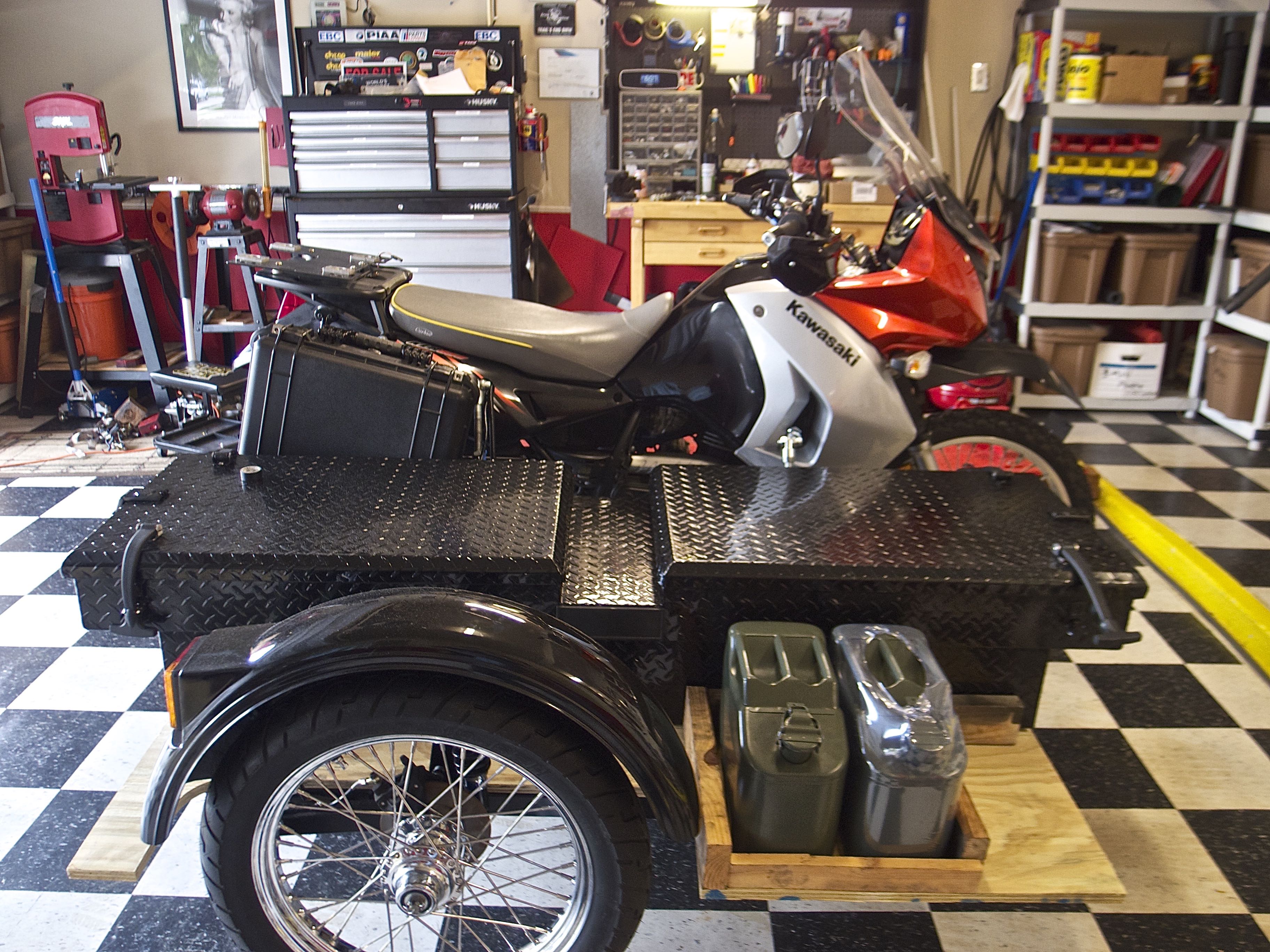 Since I don't carry a passenger, the sidecar load will consist of spare fuel, water, camping gear, tools, parts, and personal gear. Less weight than if I had a passenger.