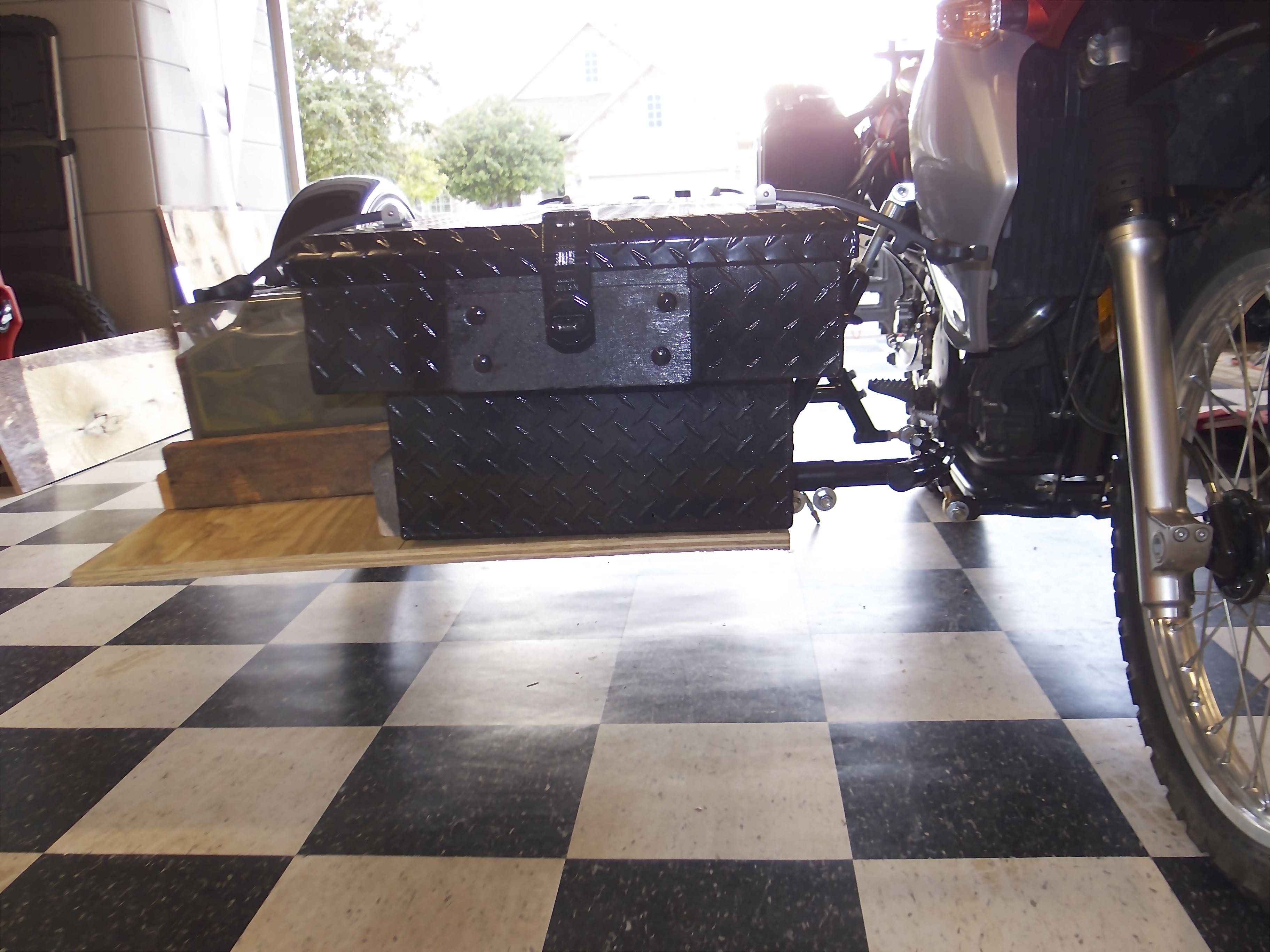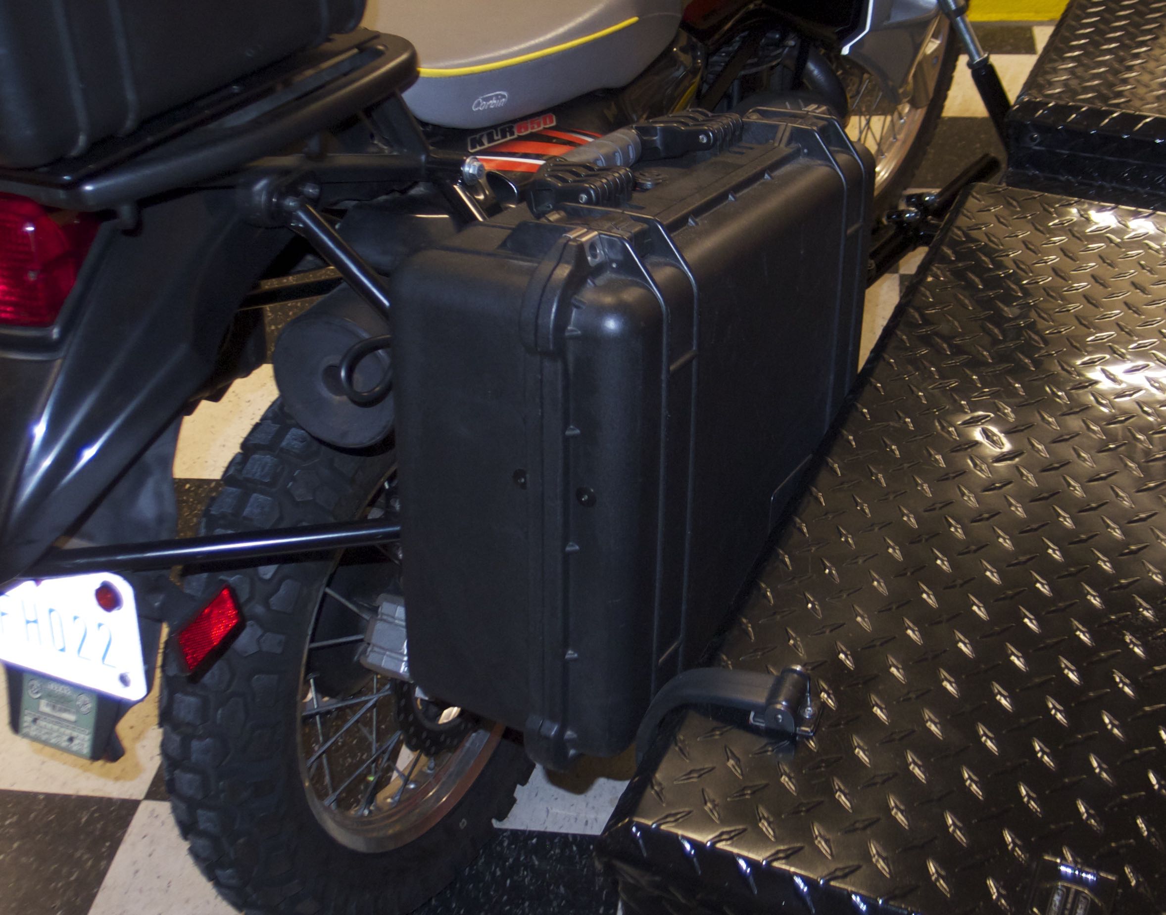 Like most complicated projects, some unforeseen developments arise. For one, the used Pelican panniers that I bought from another KLR rider fit on perfectly. The right pannier can be mounted and removed easily. However with the sidecar cargo box in place, the right pannier cannot open. If it were a top opening box, would be okay, but a side opening box is not going to work. The tool box opens fine, but the pannier cannot fully open.