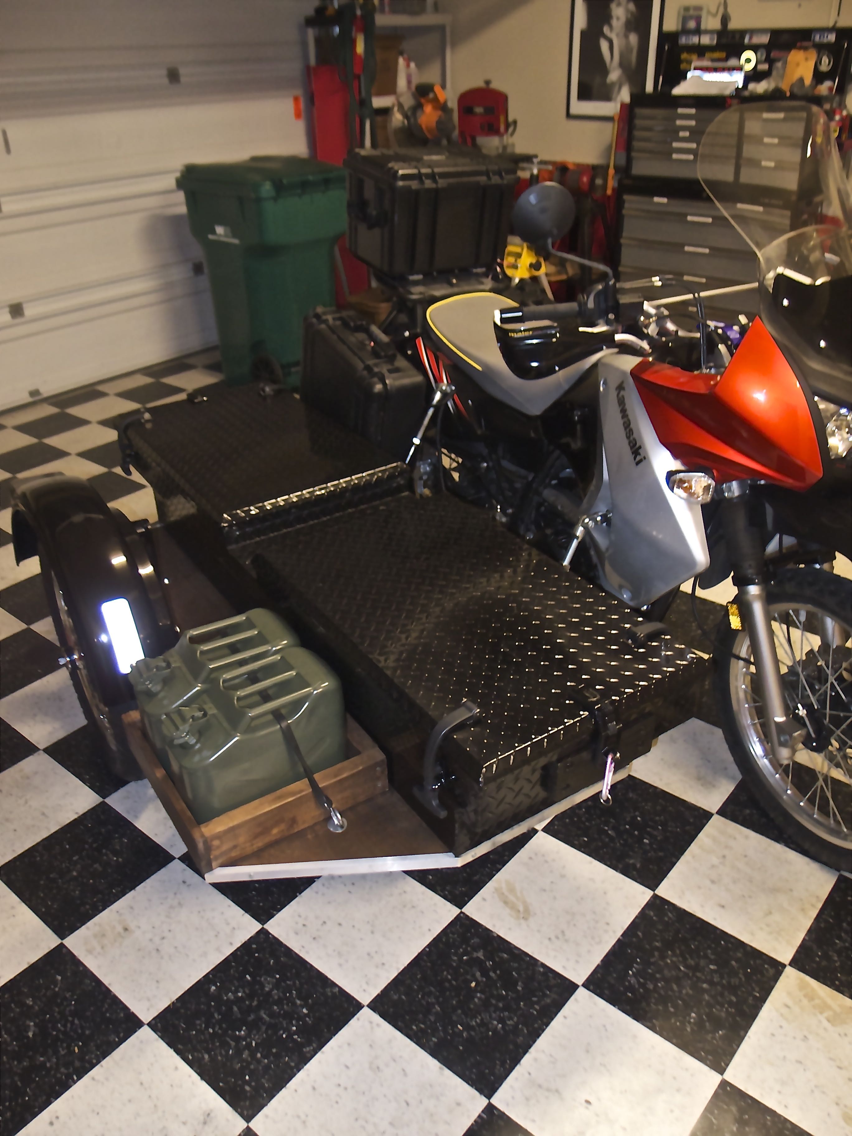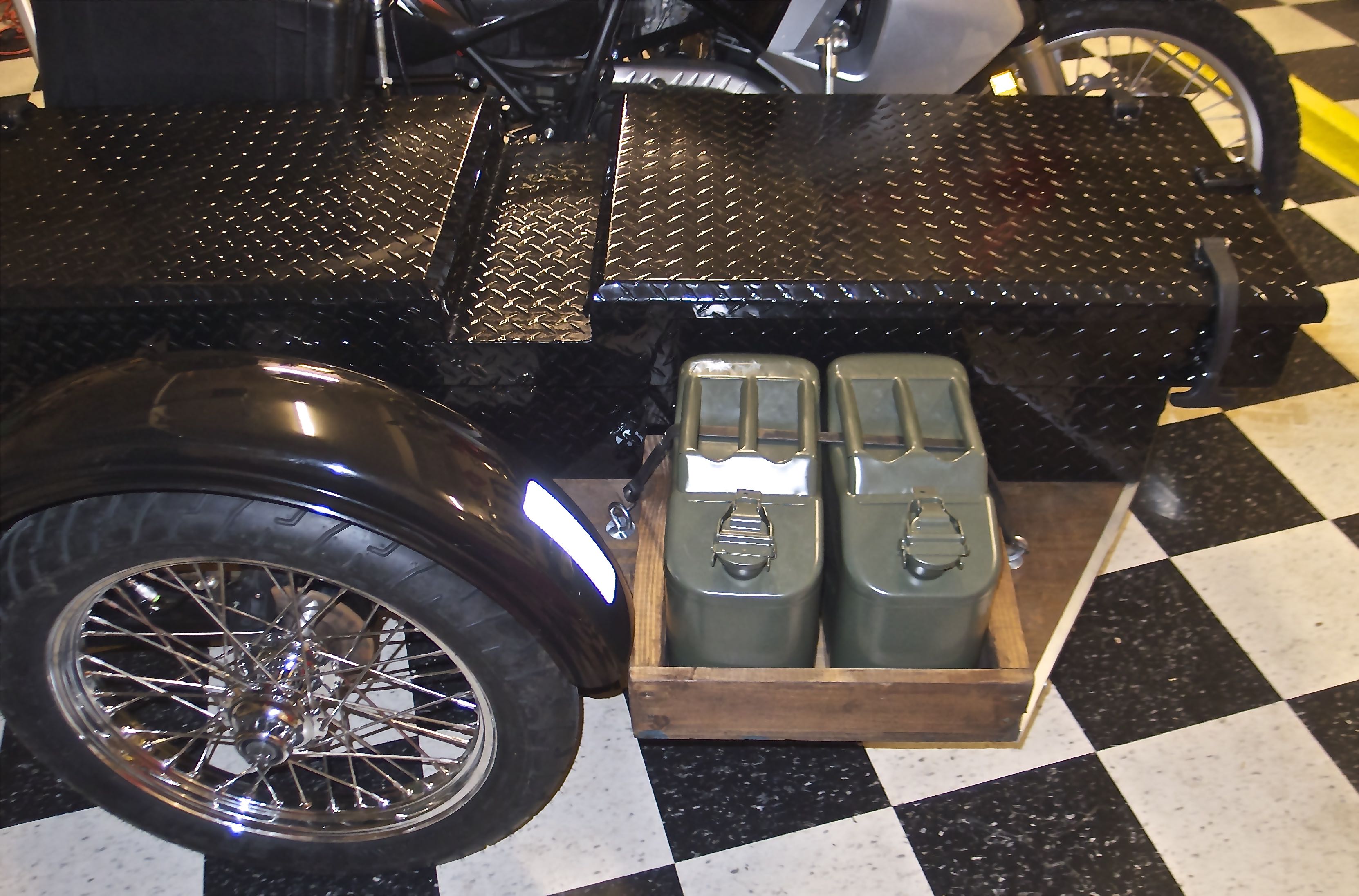 Made a box frame to hold in the two NATO gas cans, 2.5 gallons each. That will give me a total of 11-12+ gallons of gas. Will add a bicycle cable lock besides the bungee cord to keep the two gas cans. safely on board. There are several nooks and crannies where more things can be mounted to the sidecar floor. Any suggestions?