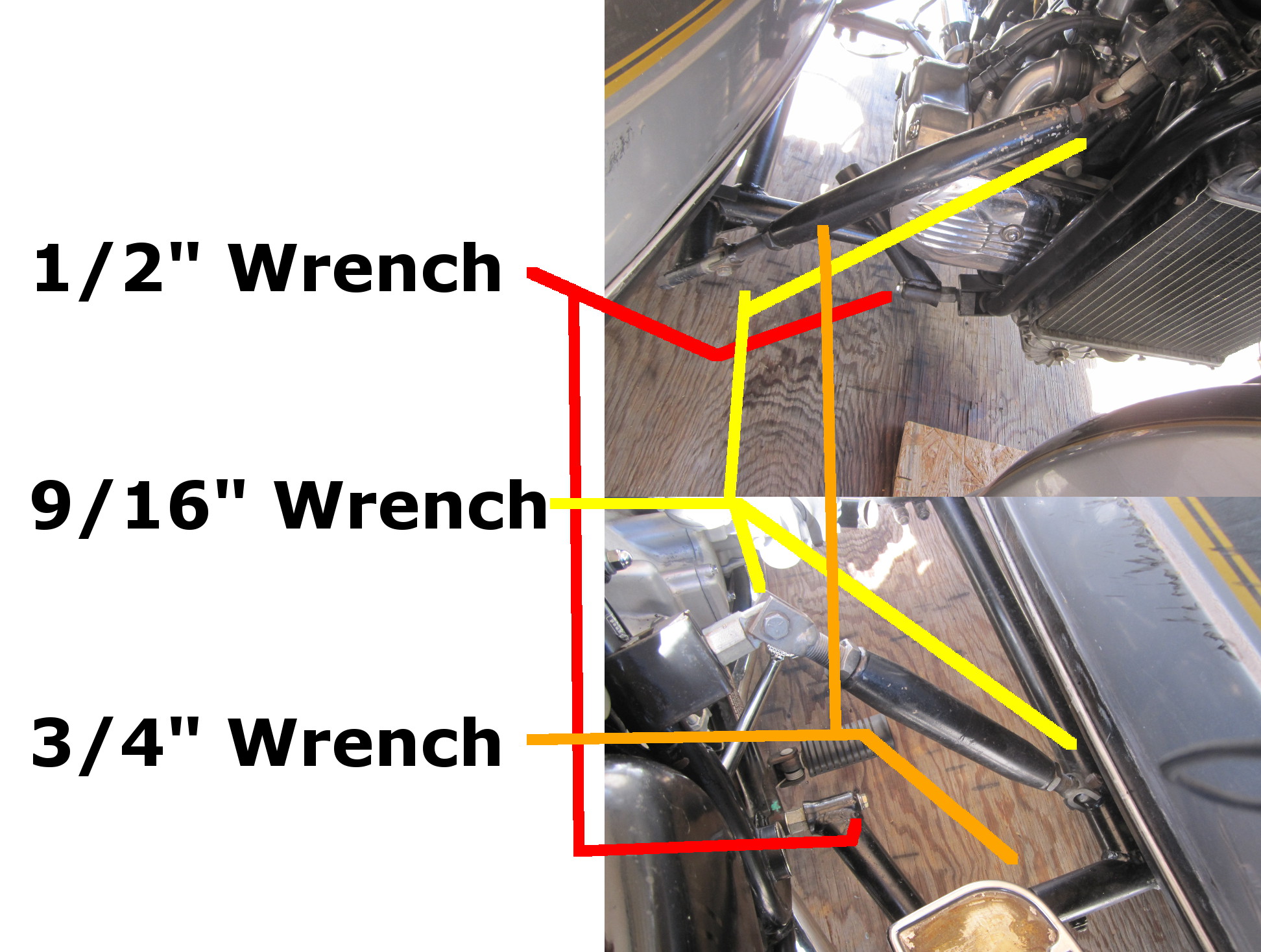 I am not familiar with the different types of mounts for the differing years of sidecars so I am a little confused as to what I type have. On mine the large bolts clamping the tubes coming from the car use a 3/4" wrench. The clamps on the tie rods use a 9/16" wrench. The lower ball joints on the bike use a 1/2" wrench. Do I have the stronger mounts or the weaker ones? Below is a picture for reference. The front mount is higher and does go through the right side lower fairing.