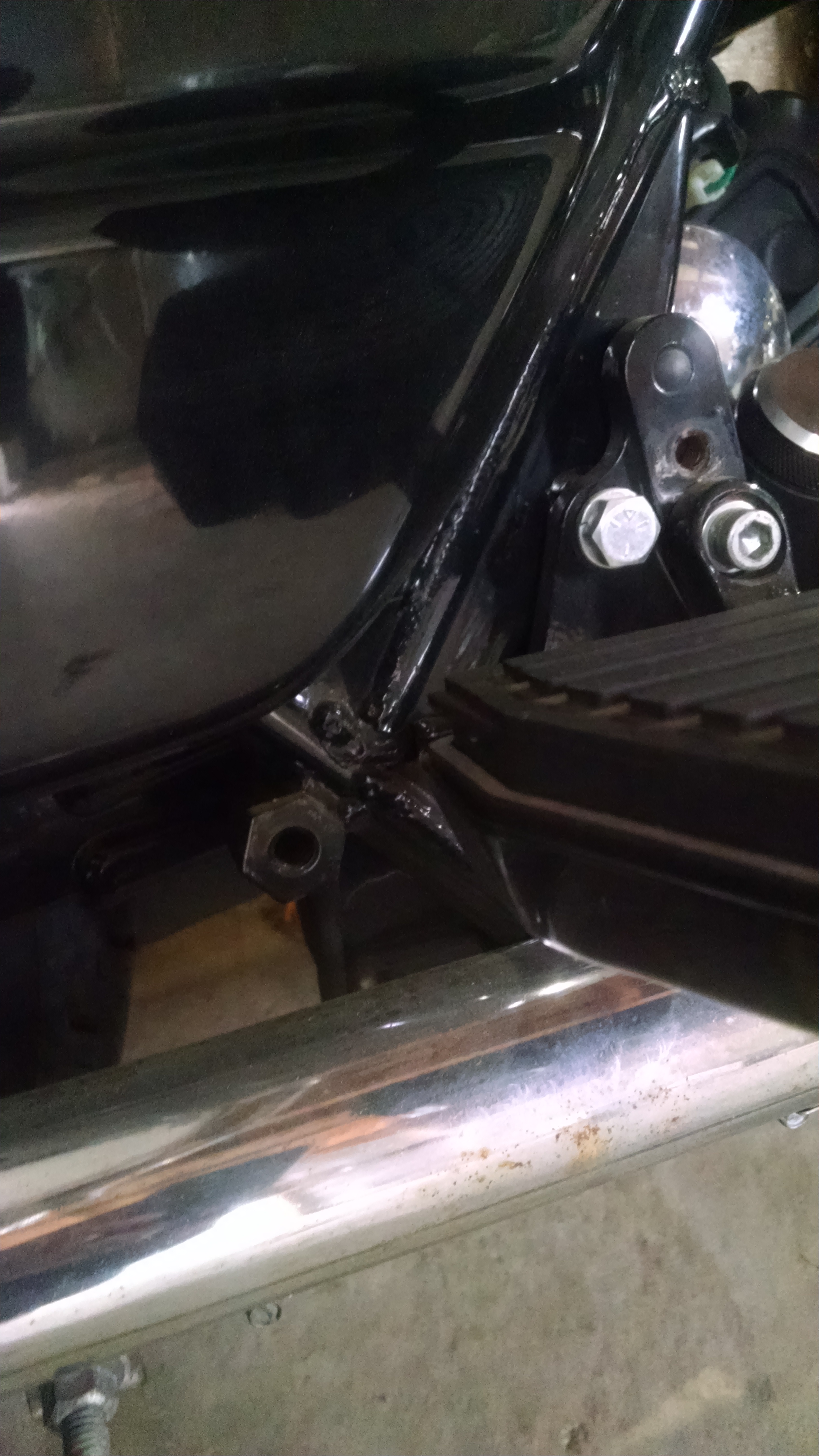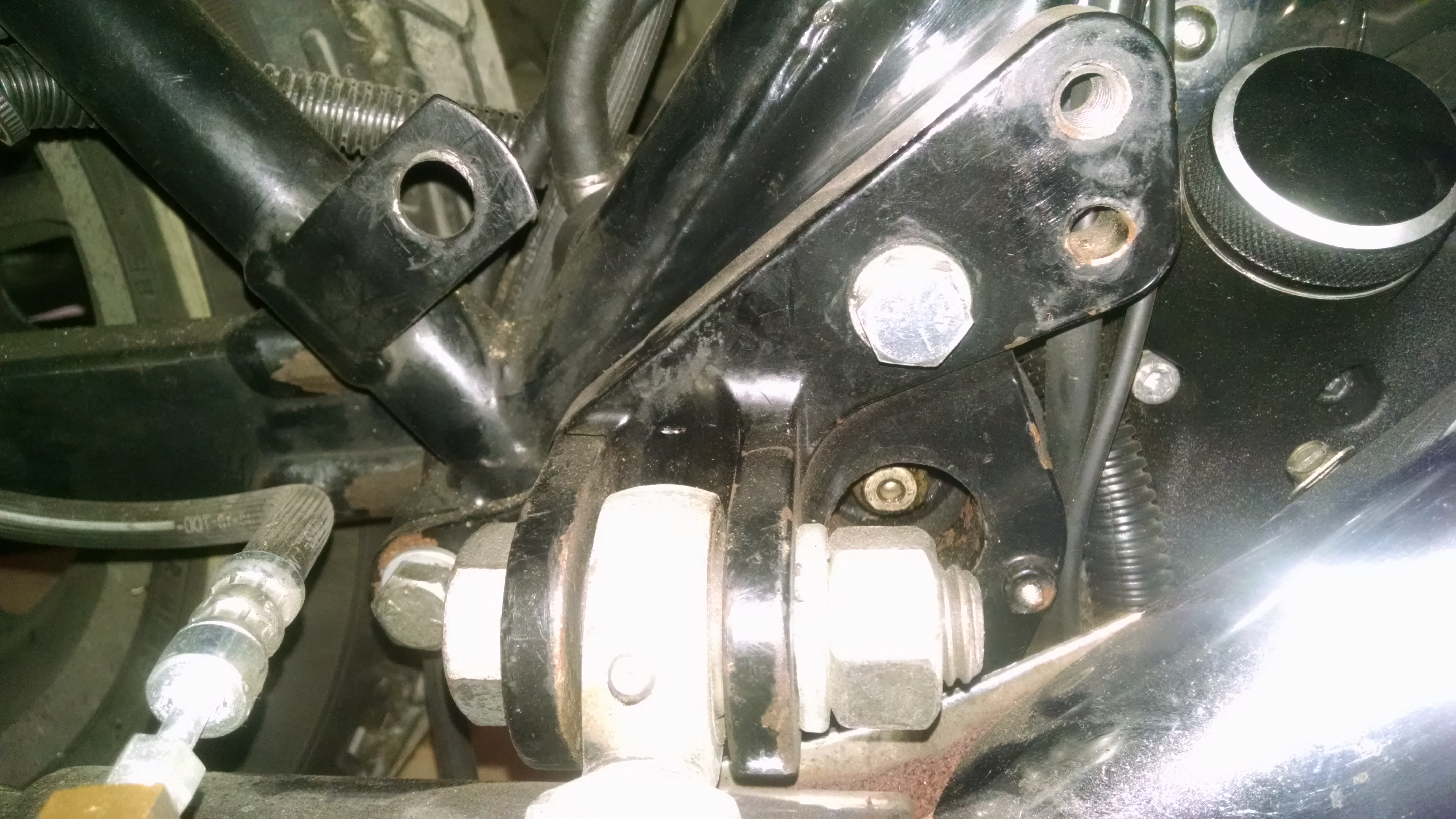 Here is a picture of the older style mount with three bolts. The third bolt is down low behind the exhaust pipe so you can't see it. The passenger footboard is removed to make it a little clearer. The bolt to the left of the clevis and rod end is the bolt that goes into the tapped hex fitting welded to the frame. The sidecar rear mount replaces the existing passenger footboard mount. This is my 1993 Tour Glide with a 1996 TLE sidecar.