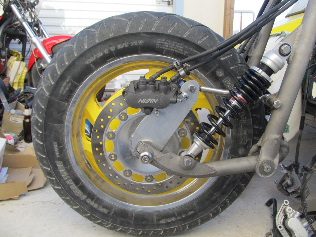 Re-designing the caliper mounts is a pain - that pattern took me all friggen day... with a hacksaw, a belt sander, and a drill press. Kinda irritating: I mailed the calipers to WASP, and then they shipped them back with the Leading Links themselves. Somehow, the caliper mount holes are short by about 8MM, meaning they used a rotor diameter 16mm less than stock... ??? They also designed them so the hoses face forward... Sigh.