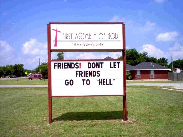 I always like the religious funny signs. Best I saw so far was in a town outside of Greenville, Tx. I don't recall the name of the town though, but was headed toward Henderson. I had my wife stop the car so that I could get a pic of it.