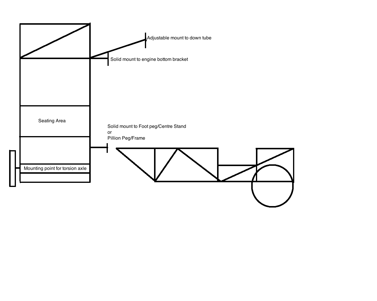 Another advantage to a frame design like Doug's (WVSporty) pic shows is that, if you keep the frame and the tub as seperate units, than you can swap out the tub for different modules. Say a flatbed with staked sides to haul camping kit or a rail with wheel chock for transporting a solo bike (think dirt bike or a roller being repaired). I've had the thought of building a wheelchair-capable tub so that I can give rides to those who otherwise can't strattle a bike.