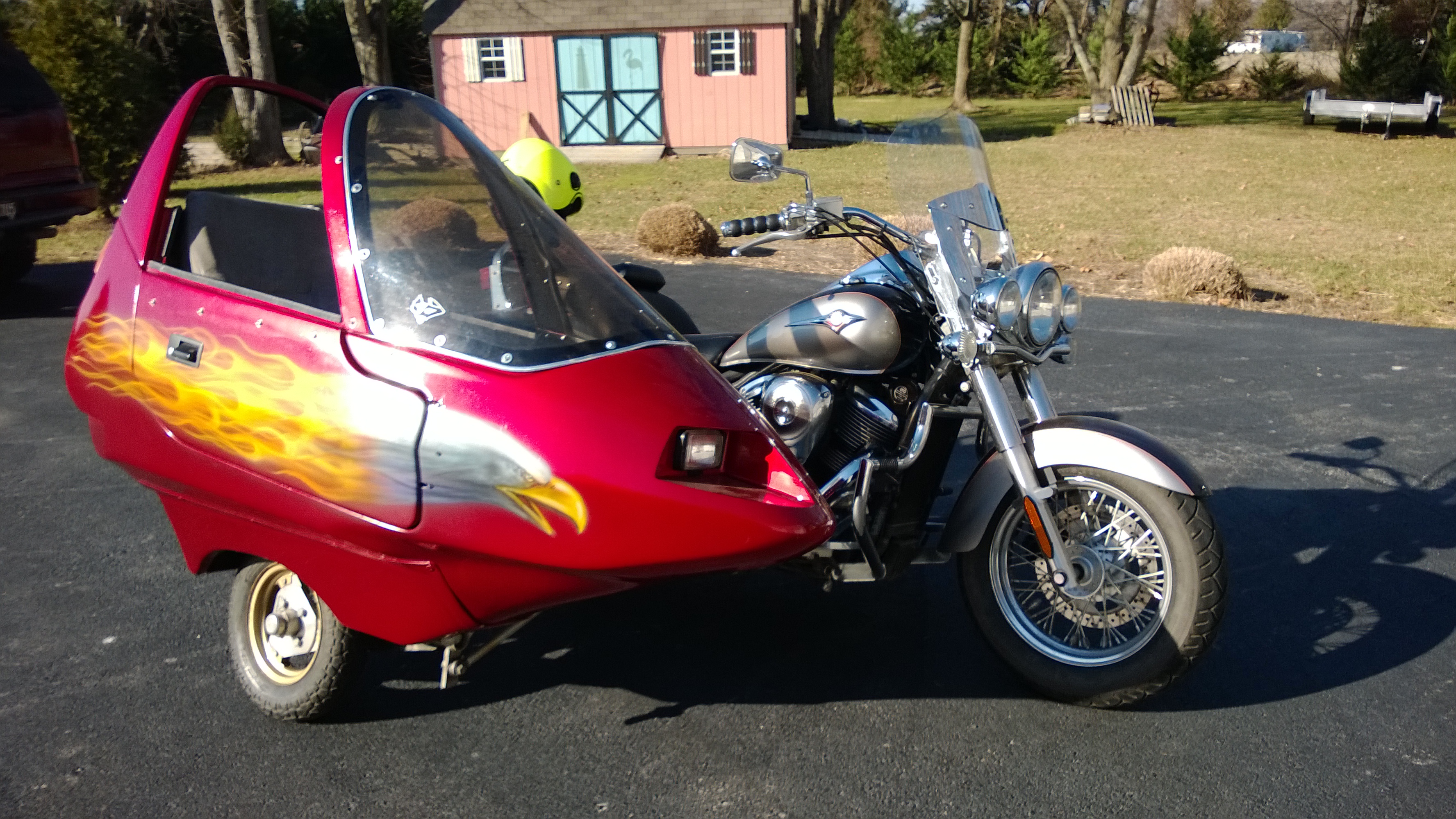So, I finally got my rig back a few weeks ago and then the holidays and "polar vortex" hit. I have only been able to get it out a few times. Got a pretty ugly attachment until I can figure out a better one; it works, but I will have to move it back a few inches as it interferes when I put my right foot down; I have to inch up ahead of time and plan accordingly for a stop. It took a little bit of time to get used to the slow speed vibration, but cruising around 45-55 does not seem to be a problem. It's better with a person as I think the weight help. Getting used to cornering came like riding a bike the 2nd time, LOL. I plan to have a lot more rides completed by the time the rally is this year.