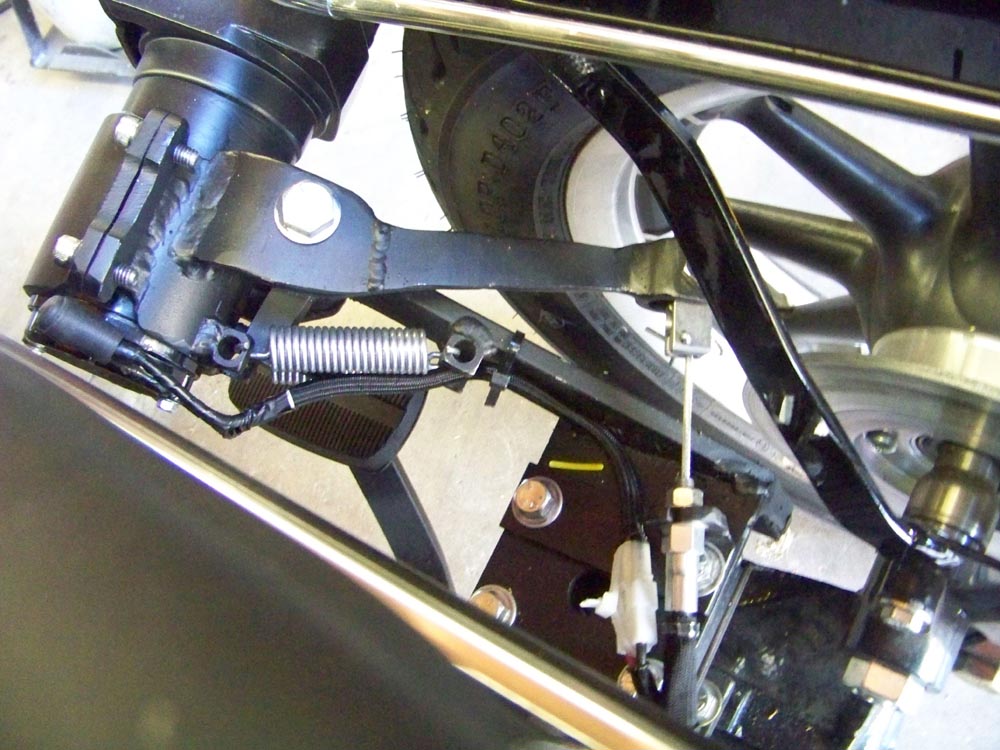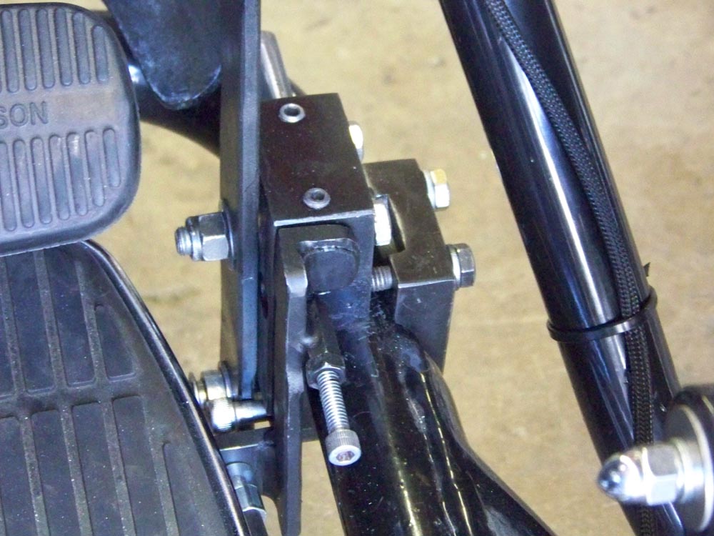 With that in mind, I also checked my parts stock and found that I had the original near-new clutch cable from my TLE conversion. The Harley sidecar makes use of a longer clutch cable that comes with their installation kit so I had the original cable left over. I decided to use that for a connection between a control lever mounted to the right of the rear brake pedal. This would pull the winch with a roller added onto the sidecar wheel at the front just under the tip of the sidecar fender.