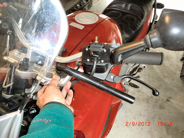 This shows the difference in angle and width from the stock bar. Since the kit comes with a longer brake hose from the master cylinder and requires brake bleeding, I went ahead and replaced all the lines with Spiegler's.