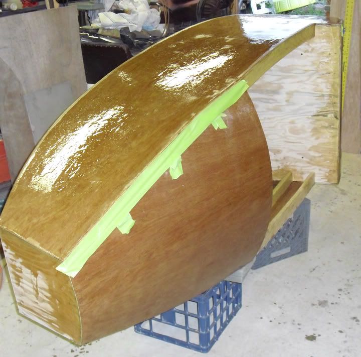 I wish the cloth was long enough to lay sideways. But it was a tad short:o( "Story of my life" :o) We got it though. The last side turned out great!!! I'm going to wet sand the body ( to get rid of a couple lumps that I have ) and roll a thinned epoxy onto it so it will be really shiny. I still have the bottom to do. It will be easy. This is a fun skill to learn. I have been gathering stuff up to build a reverse trike out of my KZ650. I'm going to make a hood to cover up some of the tubes and make it look interesting. I'm going to try a couple new things on that:o) It looks good in my head:o)