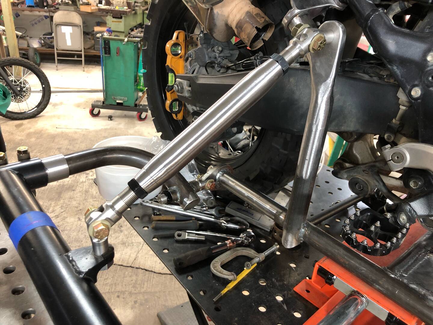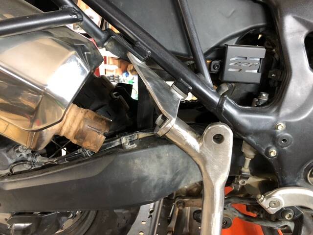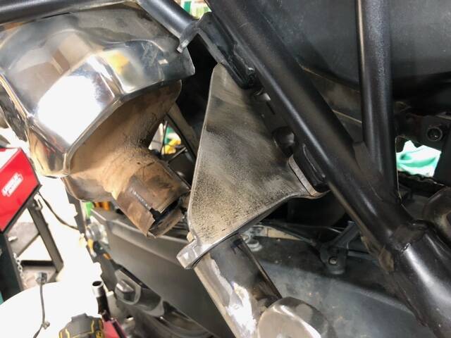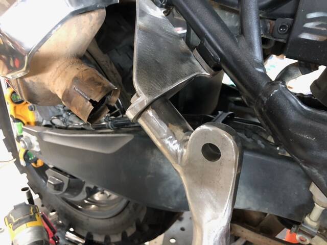 He is using the former pillion foot peg mount on the bike, and bolting a fabricated mount to that location, then will install a mounting strut from there to the sidecar frame.