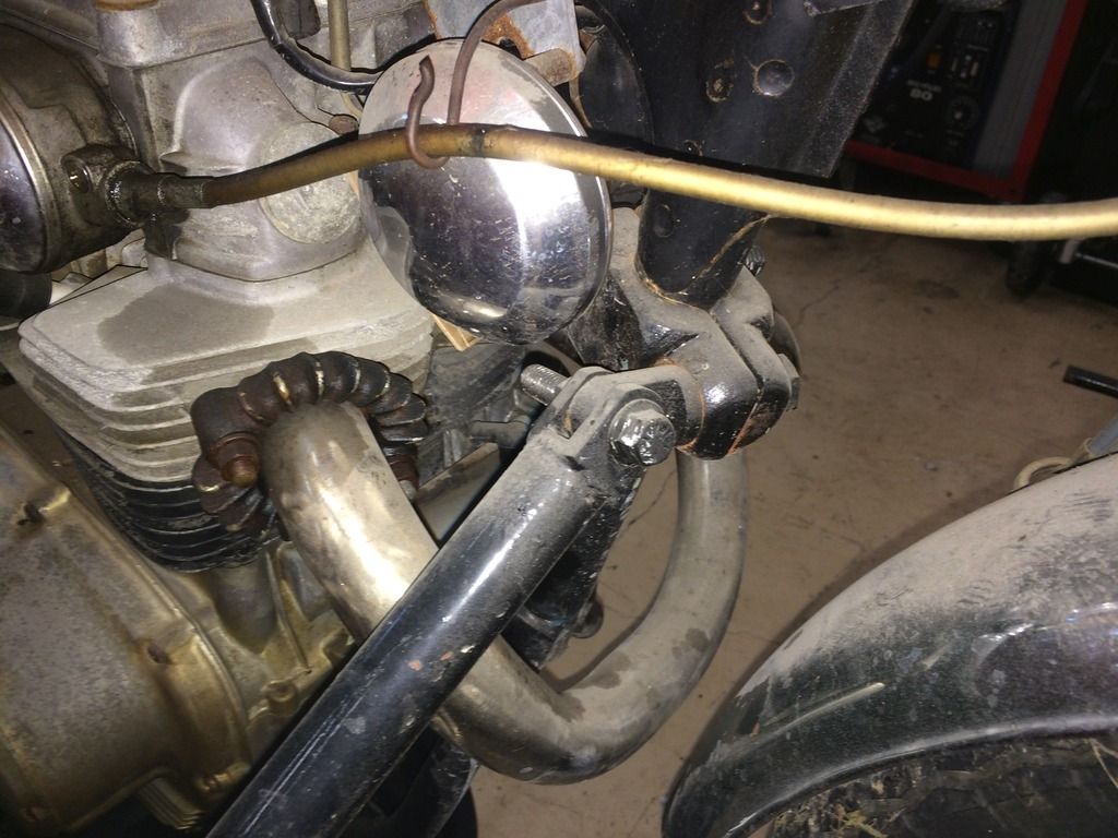 On my new to me 71 CL350 I need to adjust the lean of the bike but on the front "lean adjustment" bar I'm all the way out on the threads. Now the way that bar attaches to the front frame is with a clamp and of course I can loosen and slide it up and down. My problem is that this is the "scrambler" model and the exhaust is in the way of what looks like the ideal spot. My question is how low can I go on that front attachment before it becomes dangerous? If I drop it below the exhaust that will put it about 4 inches lower than the rear attachment.