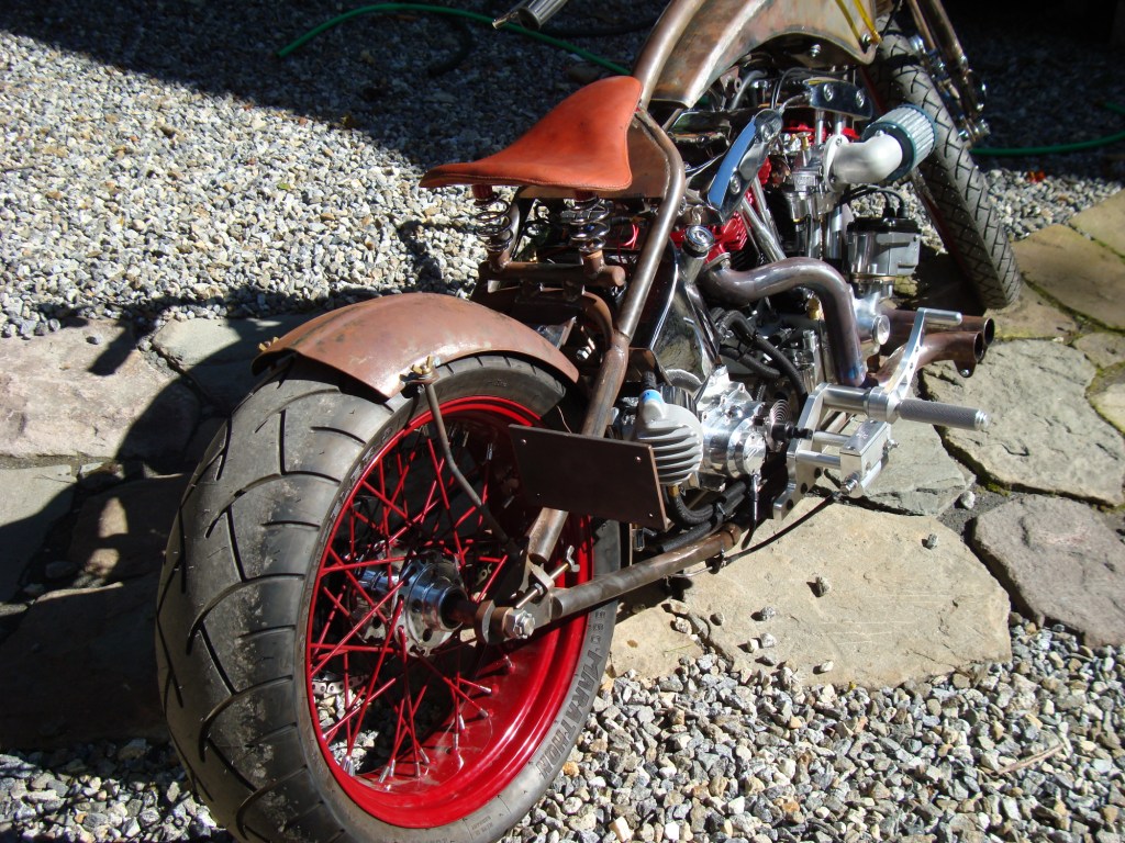 Given the look of the bike, which is really Cool, I think you need to go with a large dia spoke wheel with a MC type tire, a car type tire would take away from the look of the bike IMHO, one thing you Don't have to worry about is the license plate mount falling off 🙂
