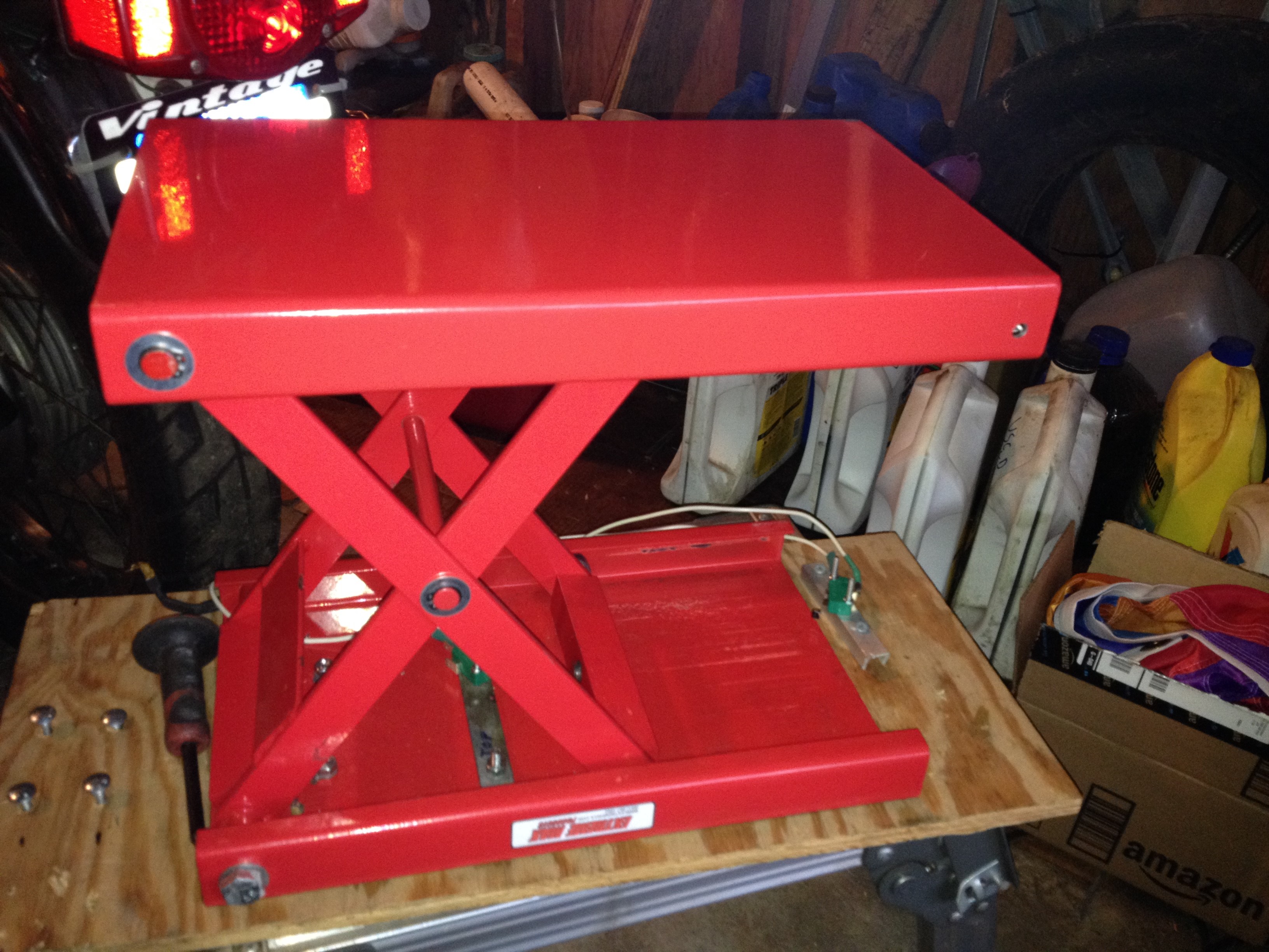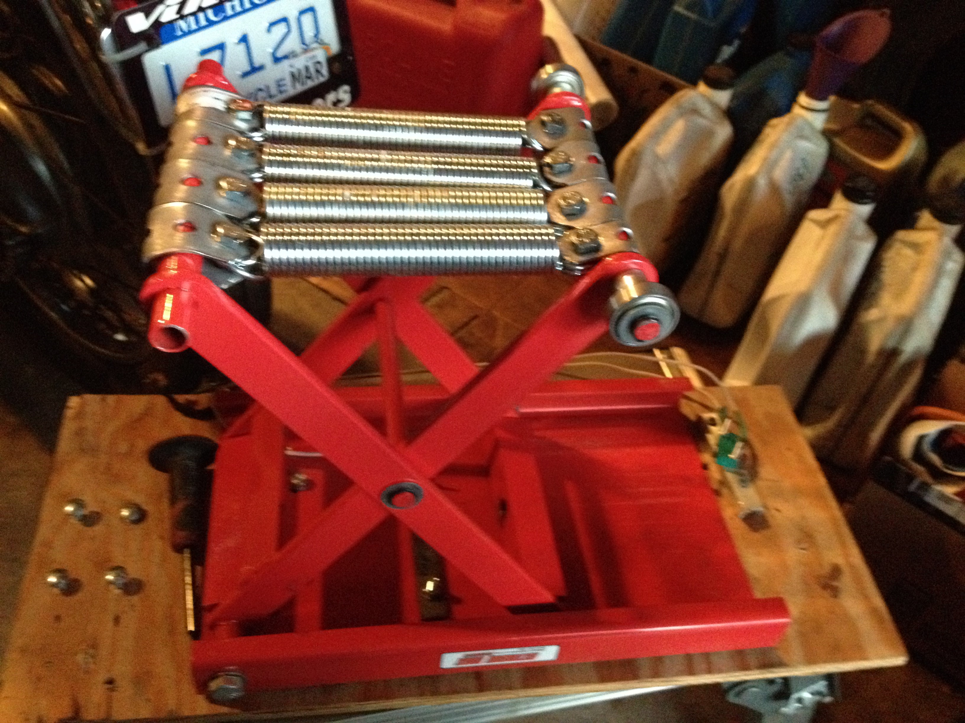 The lift seat is basically a platform jack for motorcycles. I removed the main worm screw so that the scissor is free-wheeling. To add the thrust, I'm using porch swing springs under the seat. As I said, I'm tinkering with it. I need to store just enough potential energy in the springs to help her out without the added energy of a pot hole turning the thing into 007's ejector seat! Maybe a catch lever at the bottom of travel to lock it down, or a damper. I might even put the screw back in with a bi-directional electric motor so that it's a power lift seat.